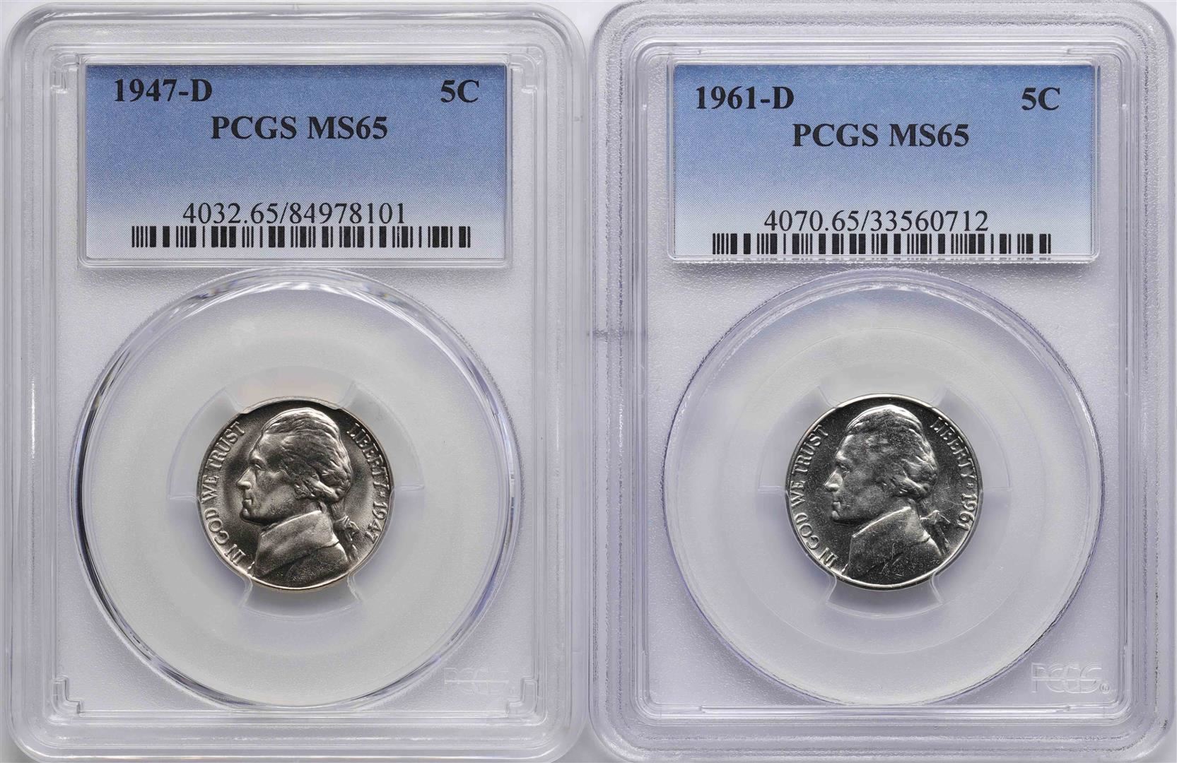 One Lot of 1947-D & 1961-D Jefferson Nickel Coins PCGS MS65. PCGS Graded.