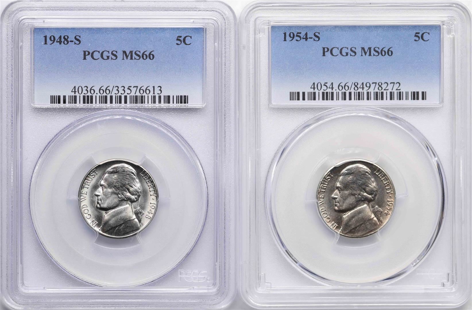 One Lot of 1948-S & 1954-S Jefferson Nickel Coins PCGS MS66. PCGS Graded.