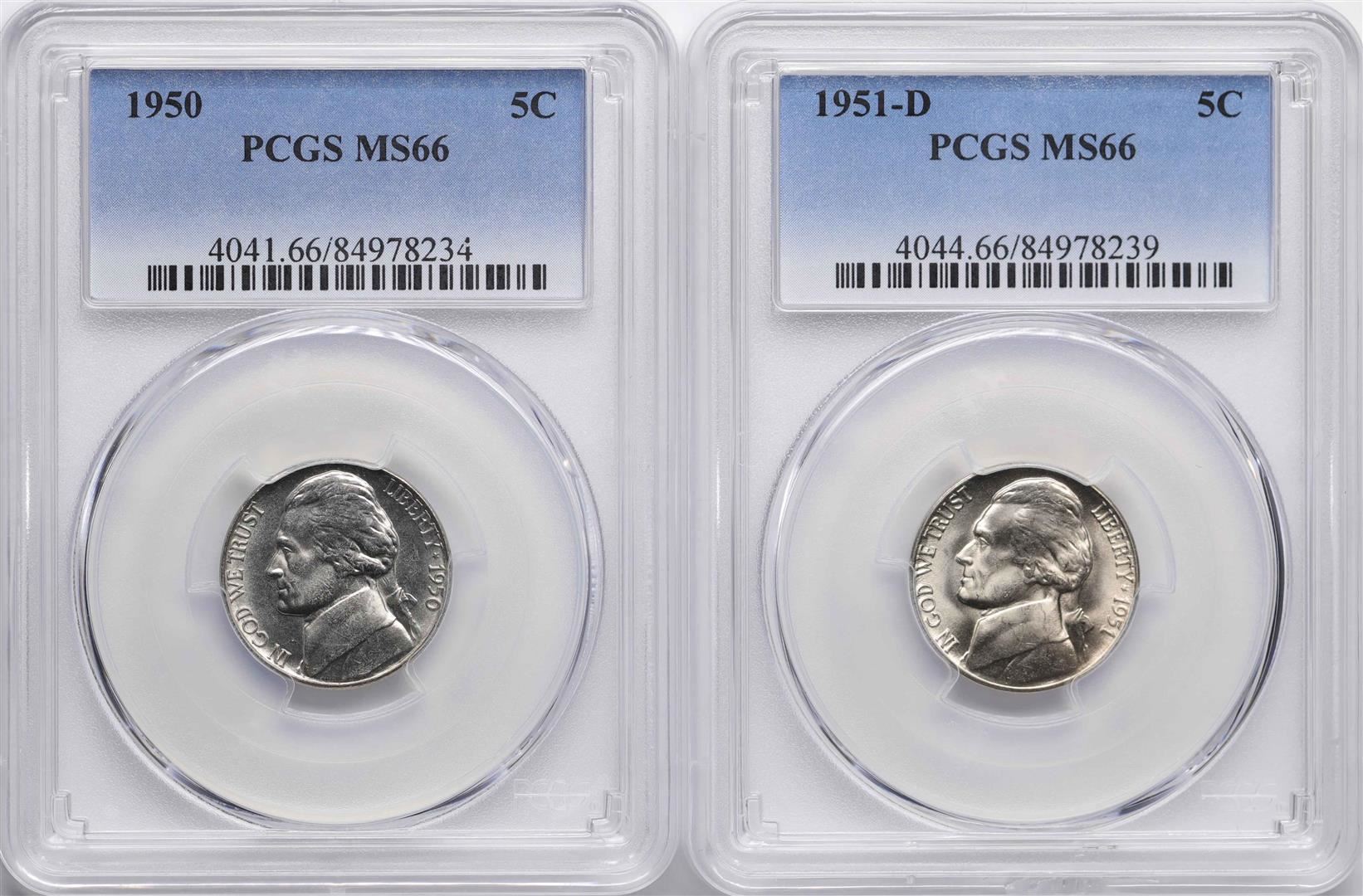 One Lot of 1950 & 1951-D Jefferson Nickel Coins PCGS MS66. PCGS Graded.