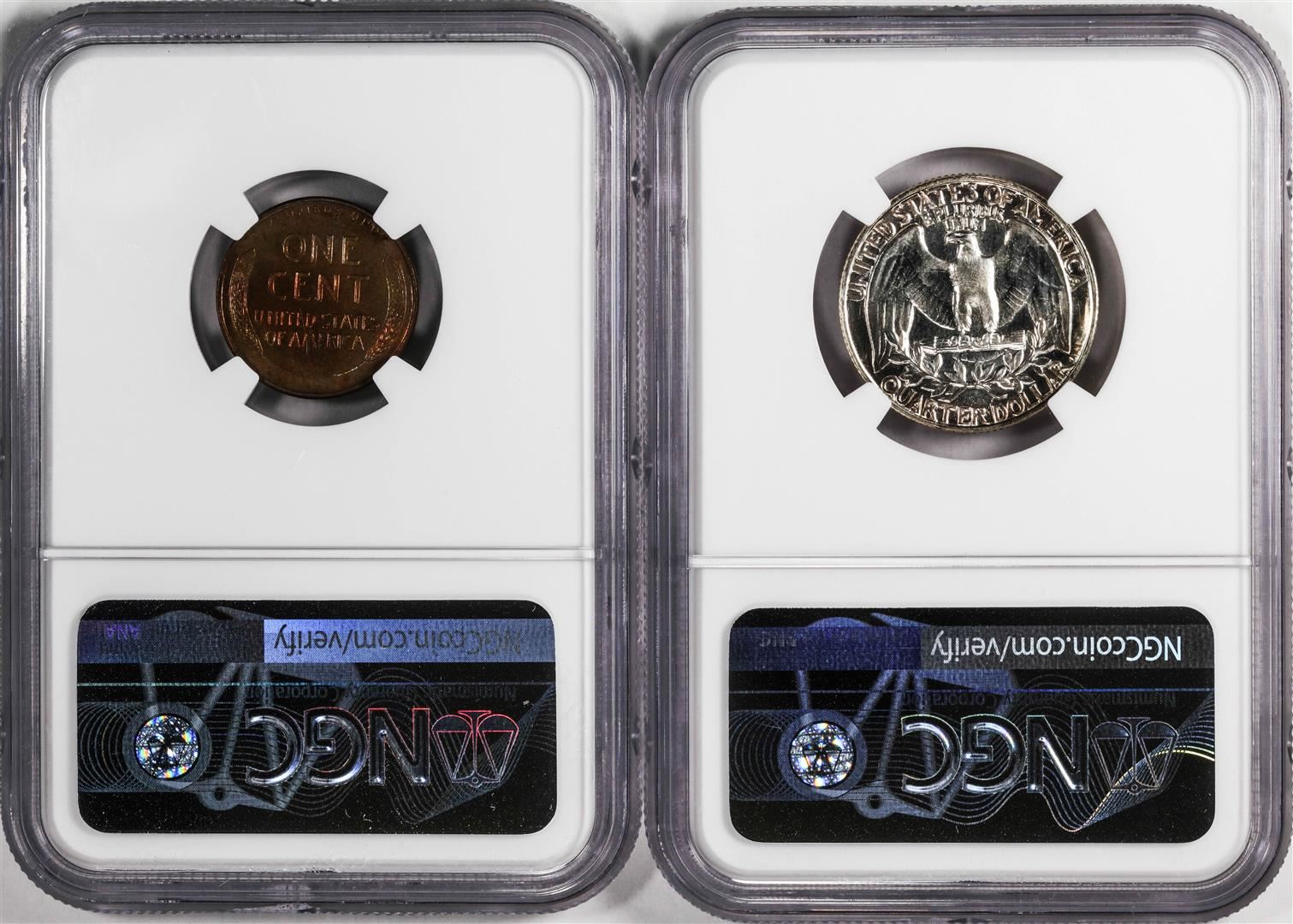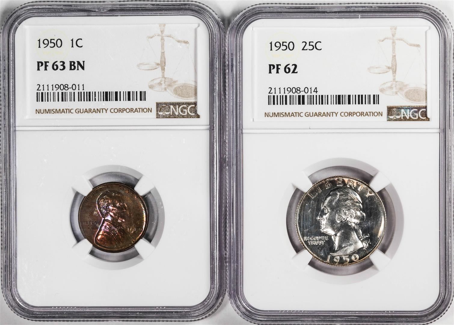 One Lot of 1950 Proof Washington Quarter and Lincoln Wheat Cent Coins NGC PF62/63BN.