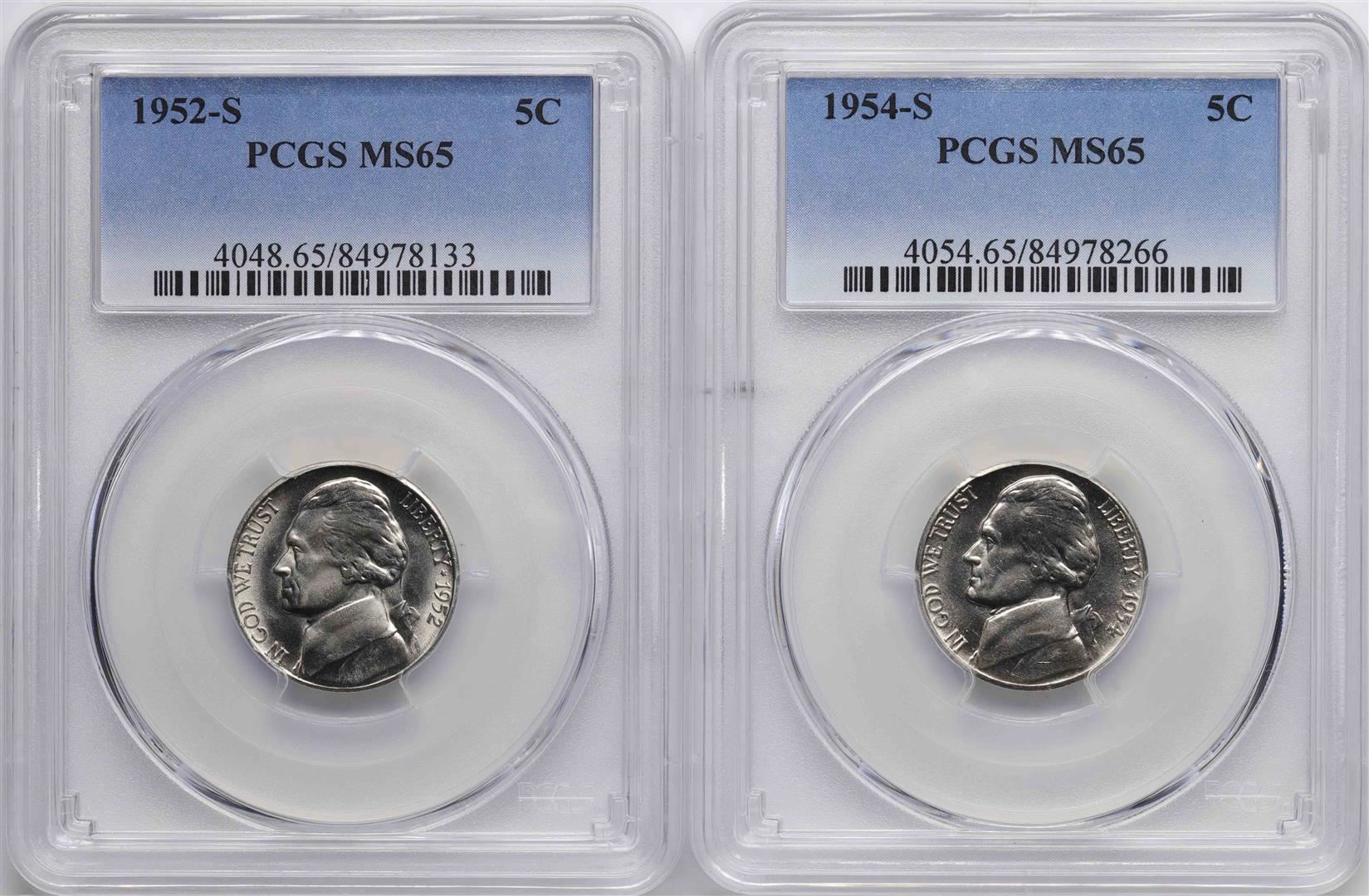 One Lot of 1952-S & 1954-S Jefferson Nickel Coins PCGS MS65. PCGS Graded.