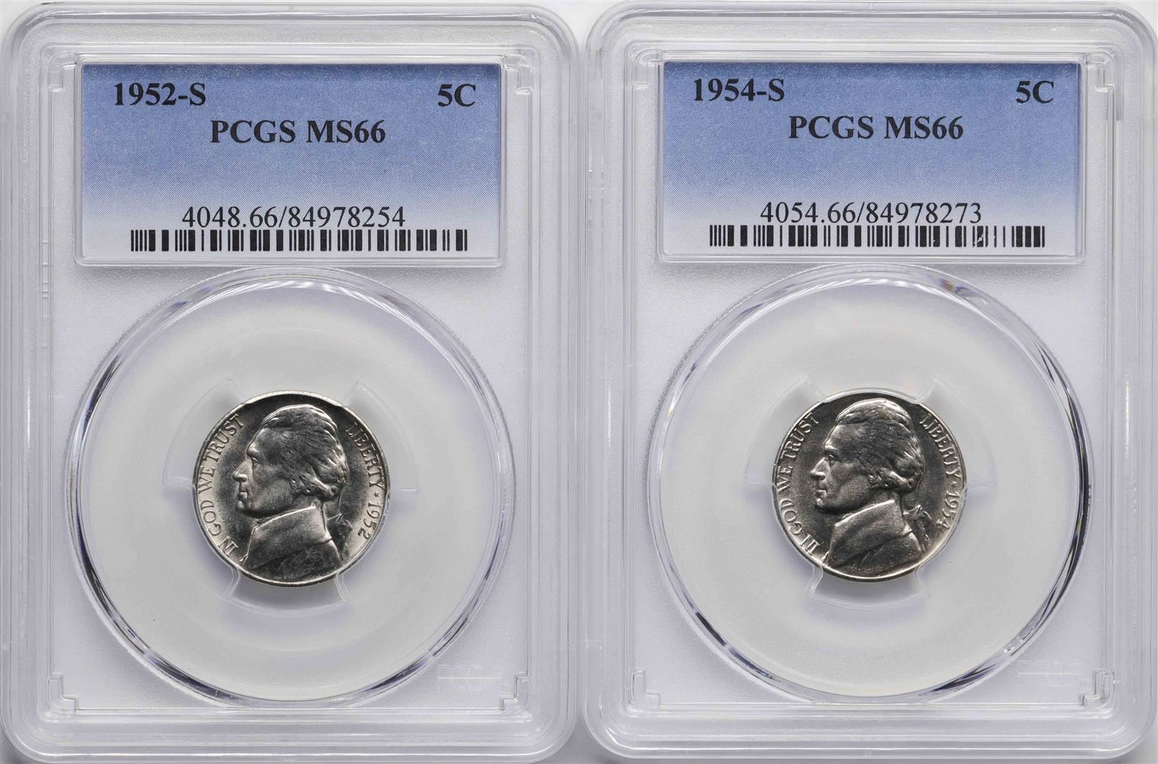One Lot of 1952-S & 1954-S Jefferson Nickel Coins PCGS MS66. PCGS Graded.