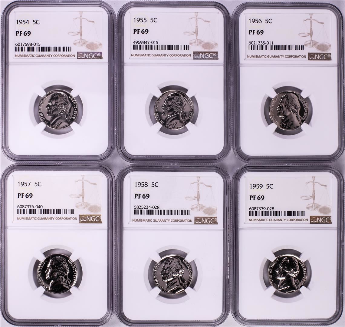 One Lot of 1954-1959 Proof Jefferson Nickel Coins NGC PF69. NGC Certified.
