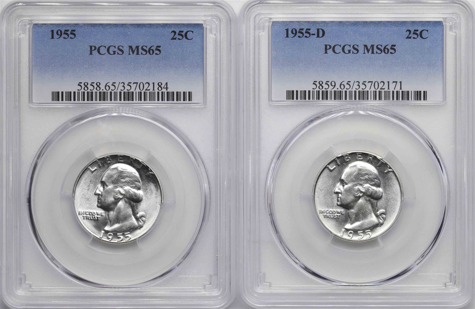 One Lot of 1955 & 1955-D Washington Quarter Coins PCGS MS65. PCGS Graded.
