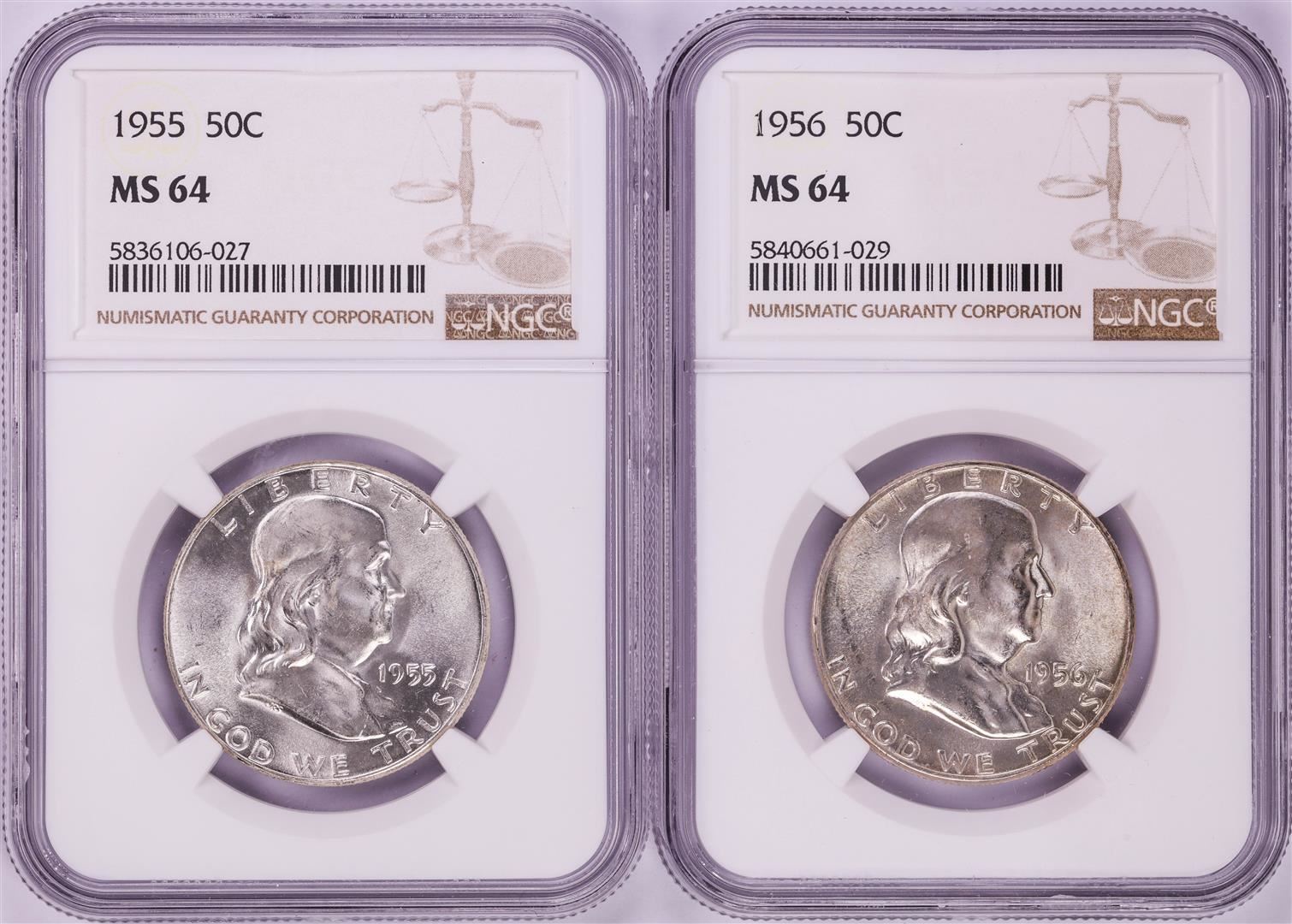 One Lot of 1955-1956 Franklin Half Dollar Coins NGC MS64. NGC Certified.