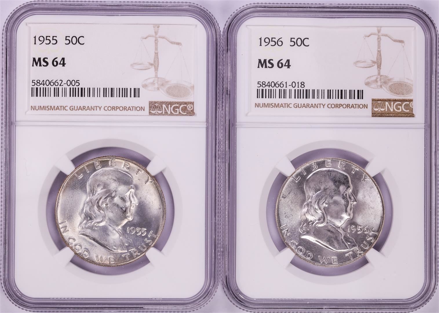 One Lot of 1955-1956 Franklin Half Dollar Coins NGC MS64. NGC Certified.
