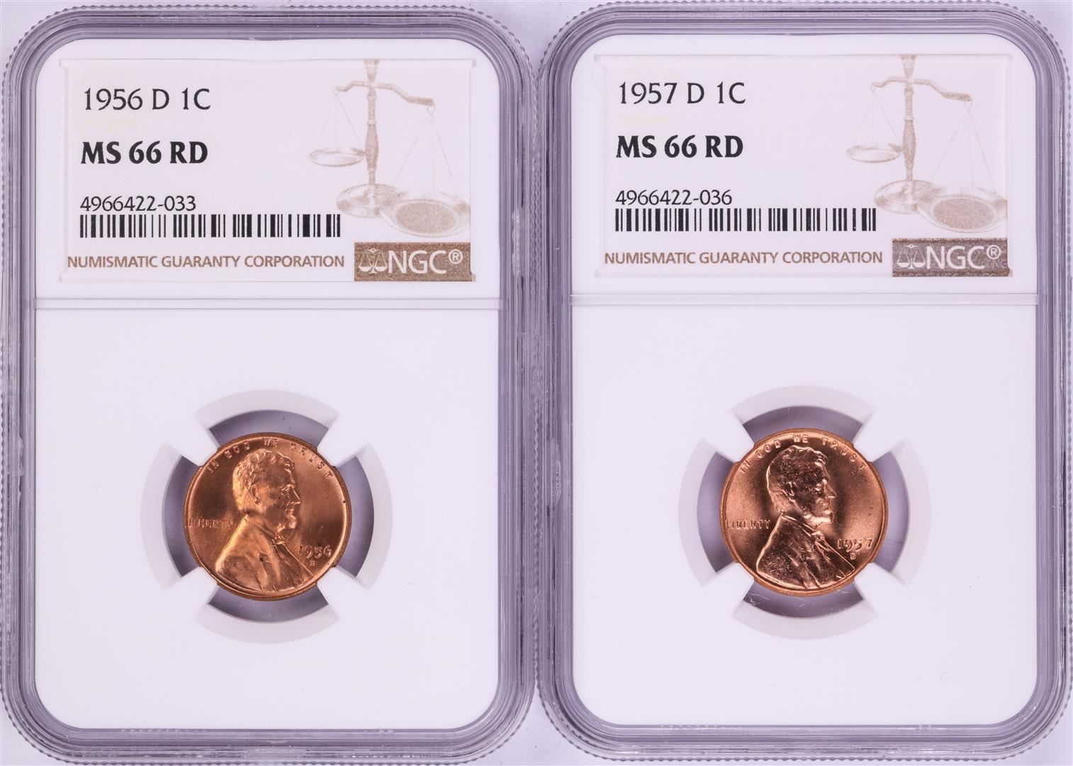 One Lot of 1956-D & 1957-D Lincoln Wheat Cent Coins NGC MS66RD. NGC Certified.