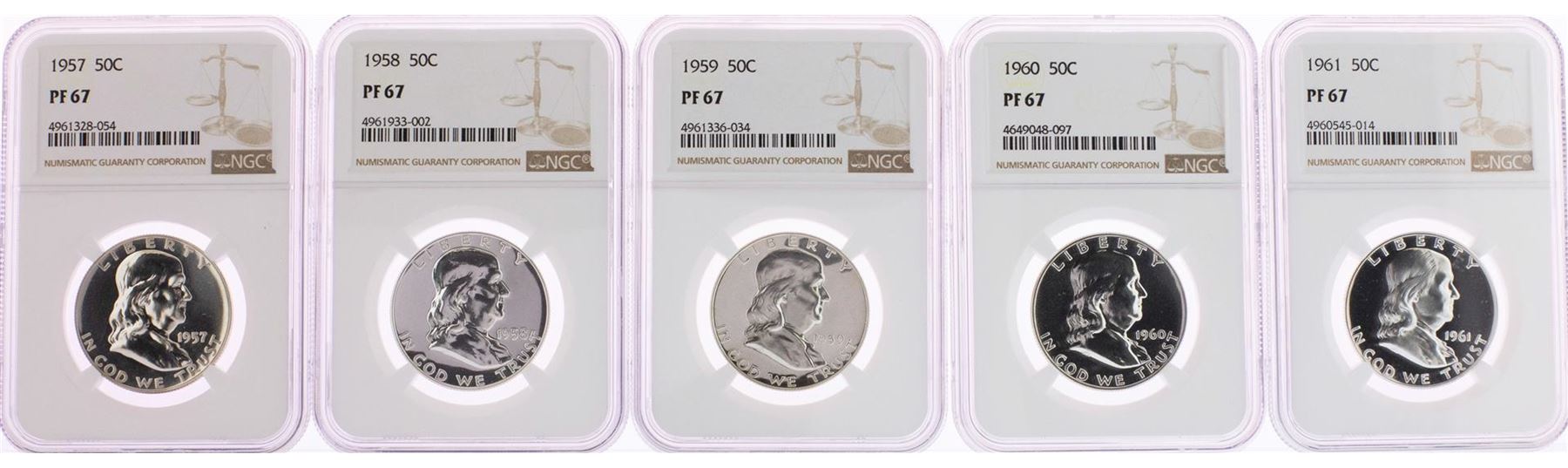 One Lot of 1957-1961 Franklin Half Dollar Coins NGC PF67. NGC Certified.