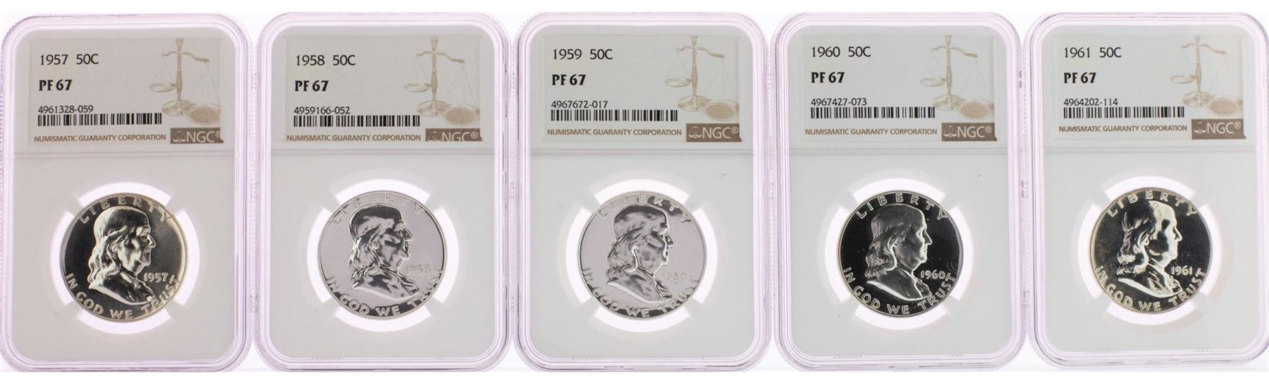 One Lot of 1957-1961 Proof Franklin Half Dollar Coins NGC PF67. NGC Certified.