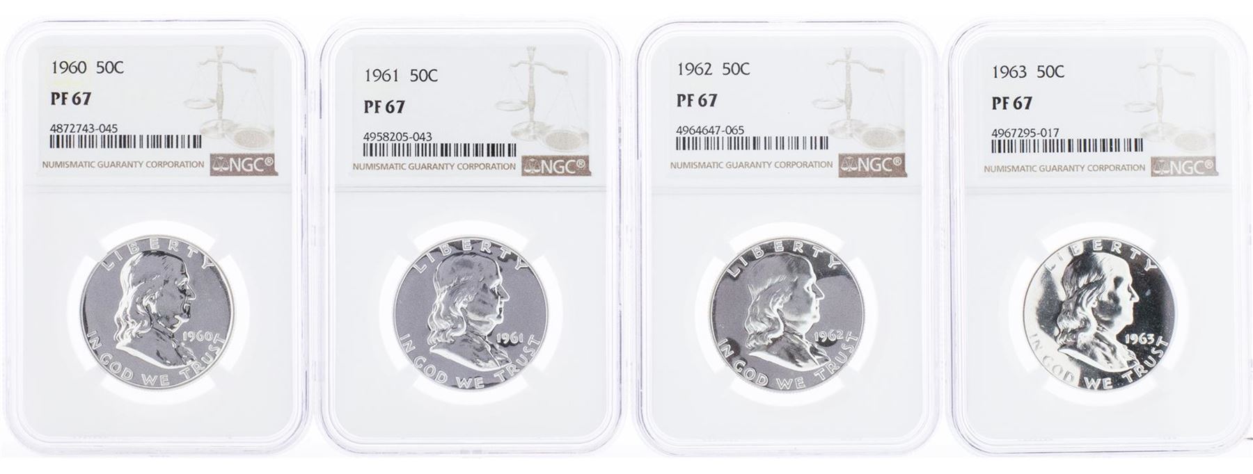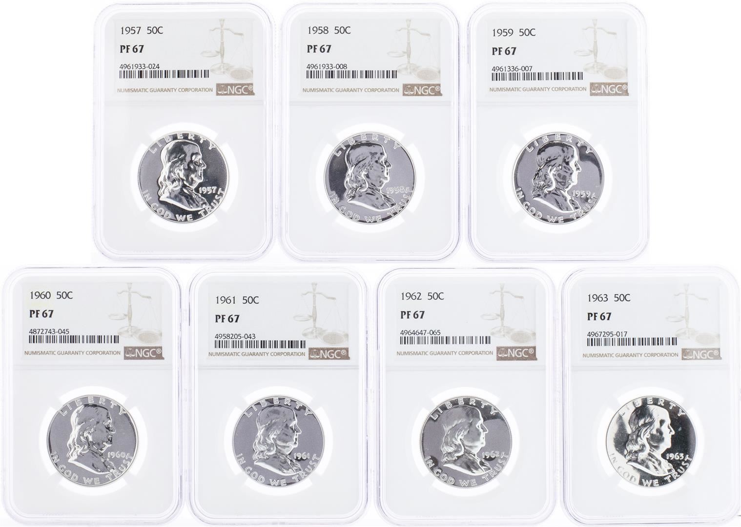 One Lot of 1957-1963 Franklin Half Dollar Coins NGC PF67. NGC Certified.