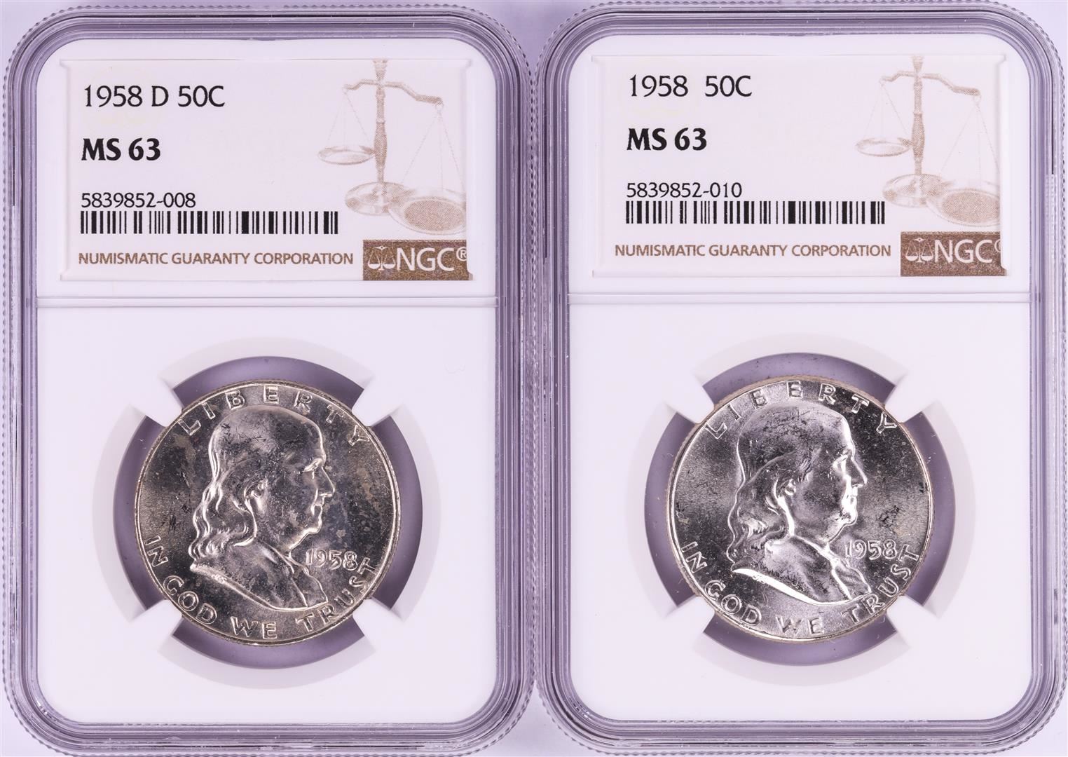 One Lot of 1958 & 1958-D Franklin Half Dollar Coins NGC MS63. NGC Certified.