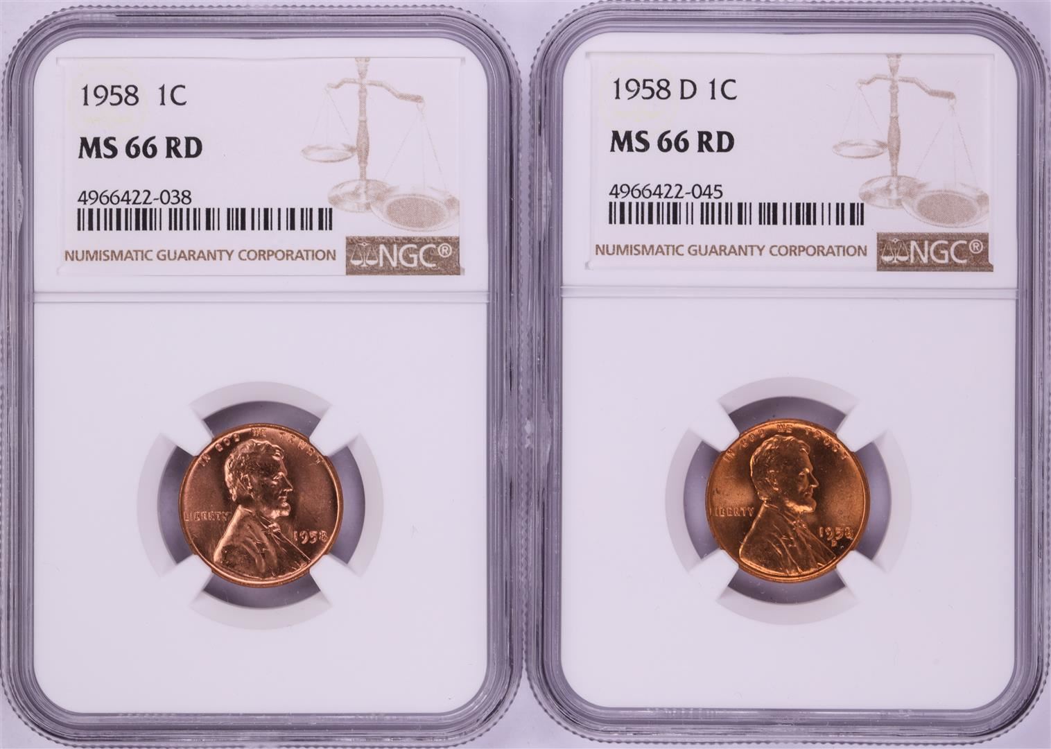 One Lot of 1958 & 1958-D Lincoln Wheat Cent Coins NGC MS66RD. NGC Certified.