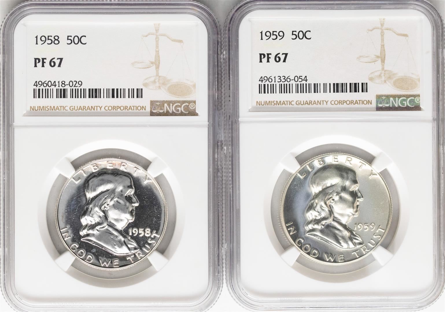One Lot of 1958 & 1959 Franklin Half Dollar Coins NGC PF67. NGC Certified.