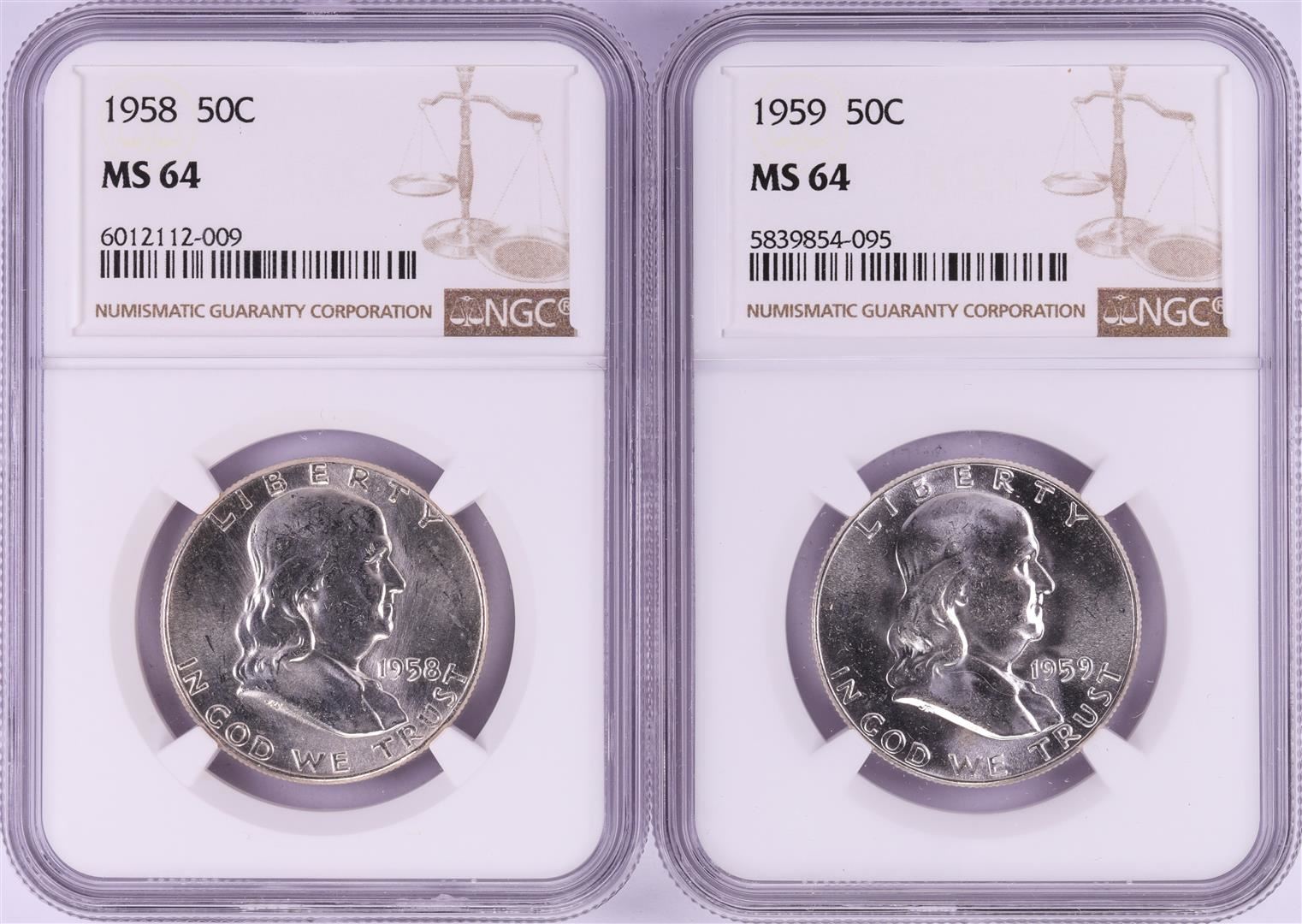 One Lot of 1958-1959 Half Dollar Coins NGC MS64. NGC Certified.