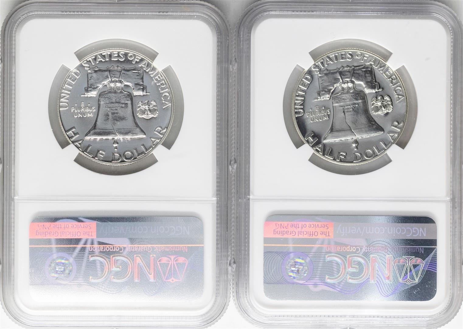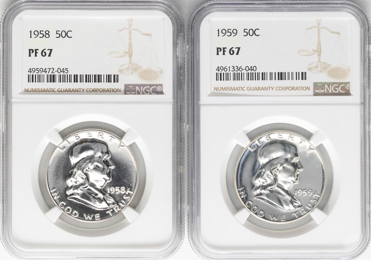 One Lot of 1958 & 1959 Proof Franklin Half Dollar Coins NGC PF67. NGC Certified.