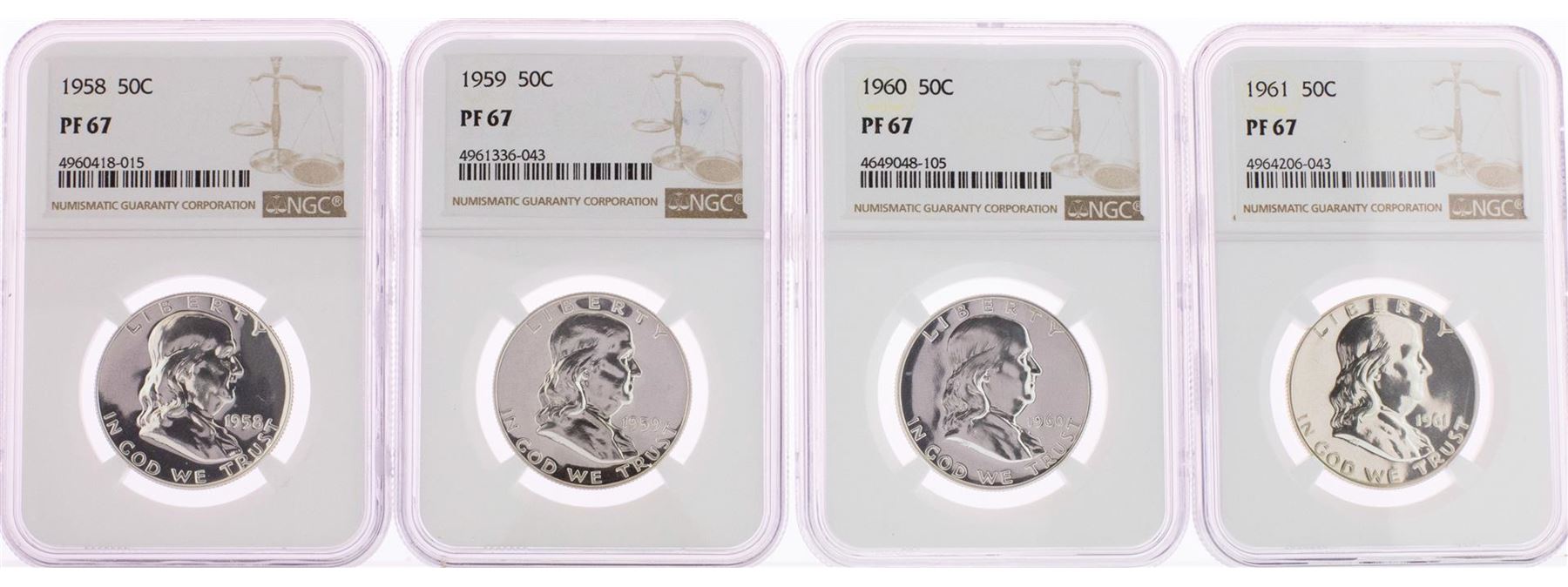 One Lot of 1958-1961 Franklin Half Dollar Coins NGC PF67. NGC Certified.