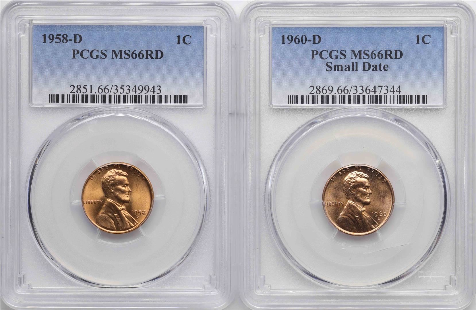 One Lot of 1958-D & 1960-D Small Date Lincoln Wheat Cent Coins PCGS MS66RD. PCGS Graded.
