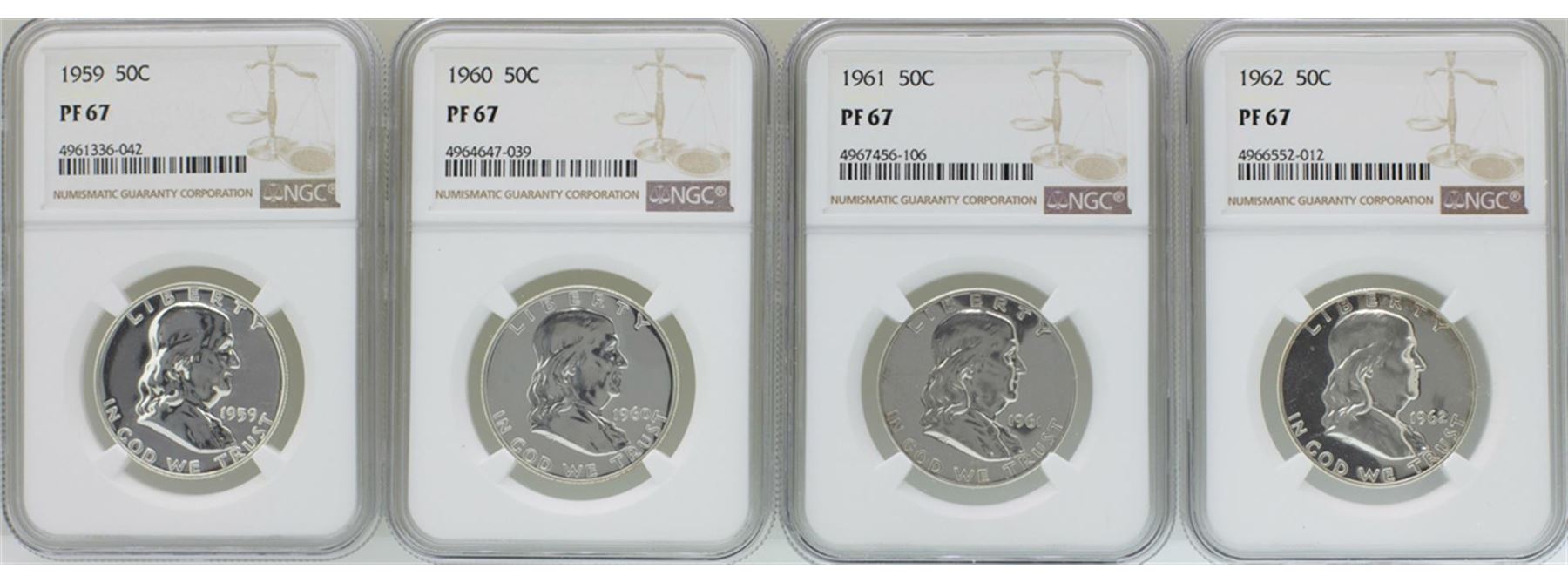 One Lot of 1959-1962 Proof Franklin Half Dollar Coins NGC PF67. NGC Certified.