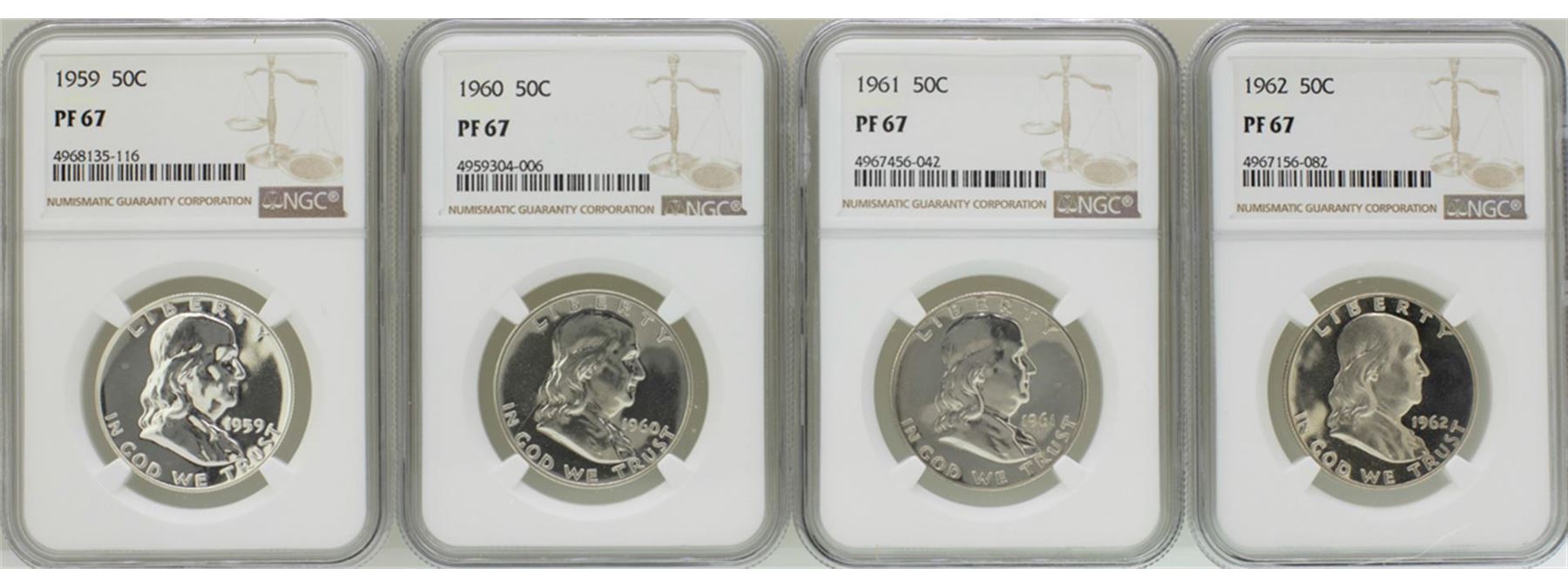 One Lot of 1959-1962 Proof Franklin Half Dollar Coins NGC PF67. NGC Certified.