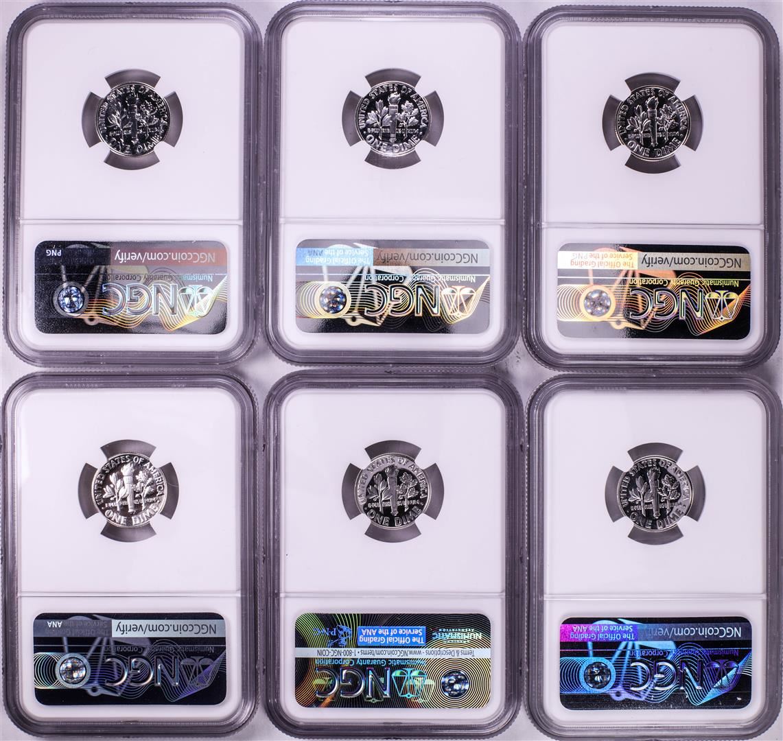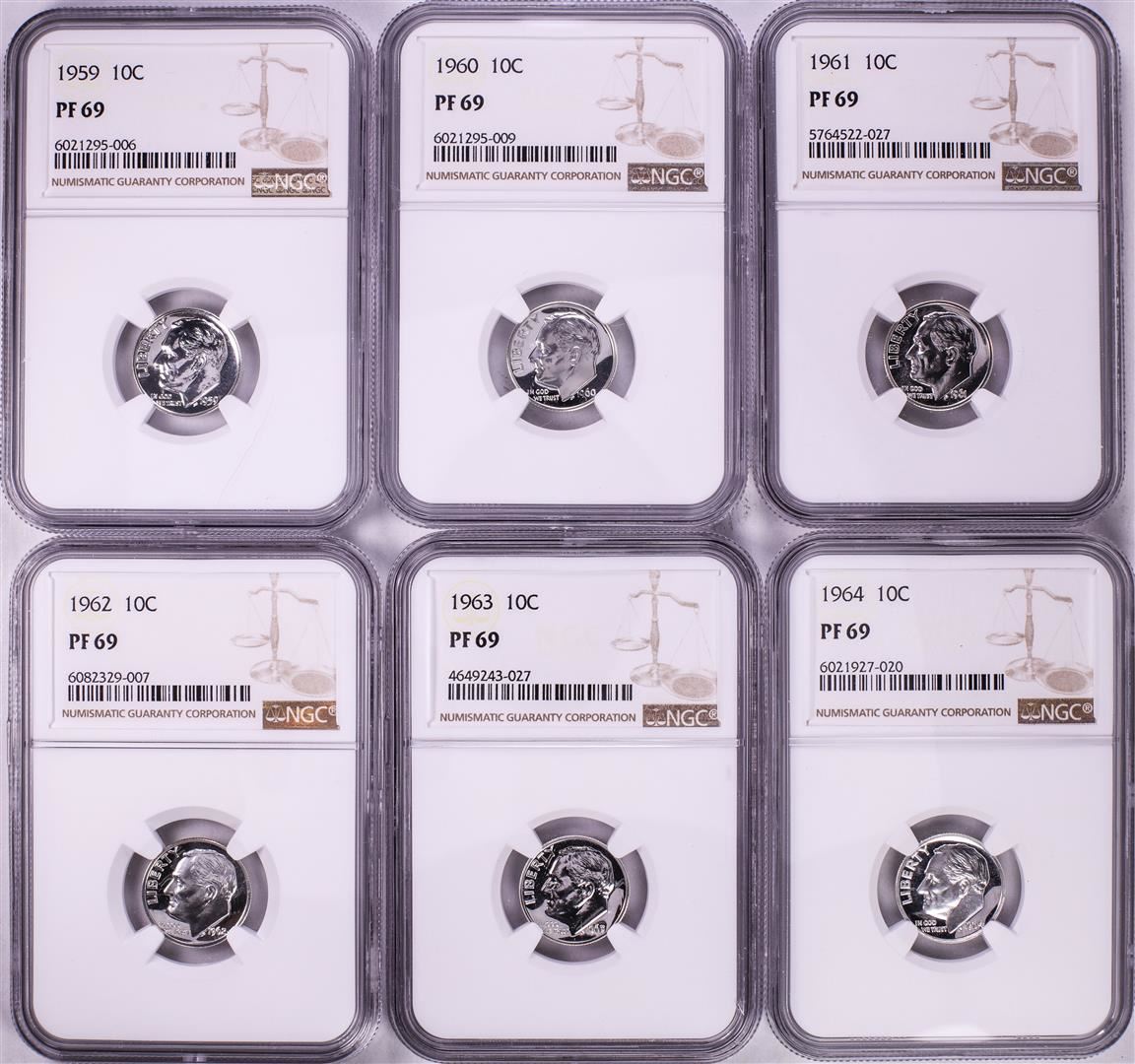 One Lot of 1959-1964 Proof Roosevelt Dime Coins NGC PF69. NGC Certified.