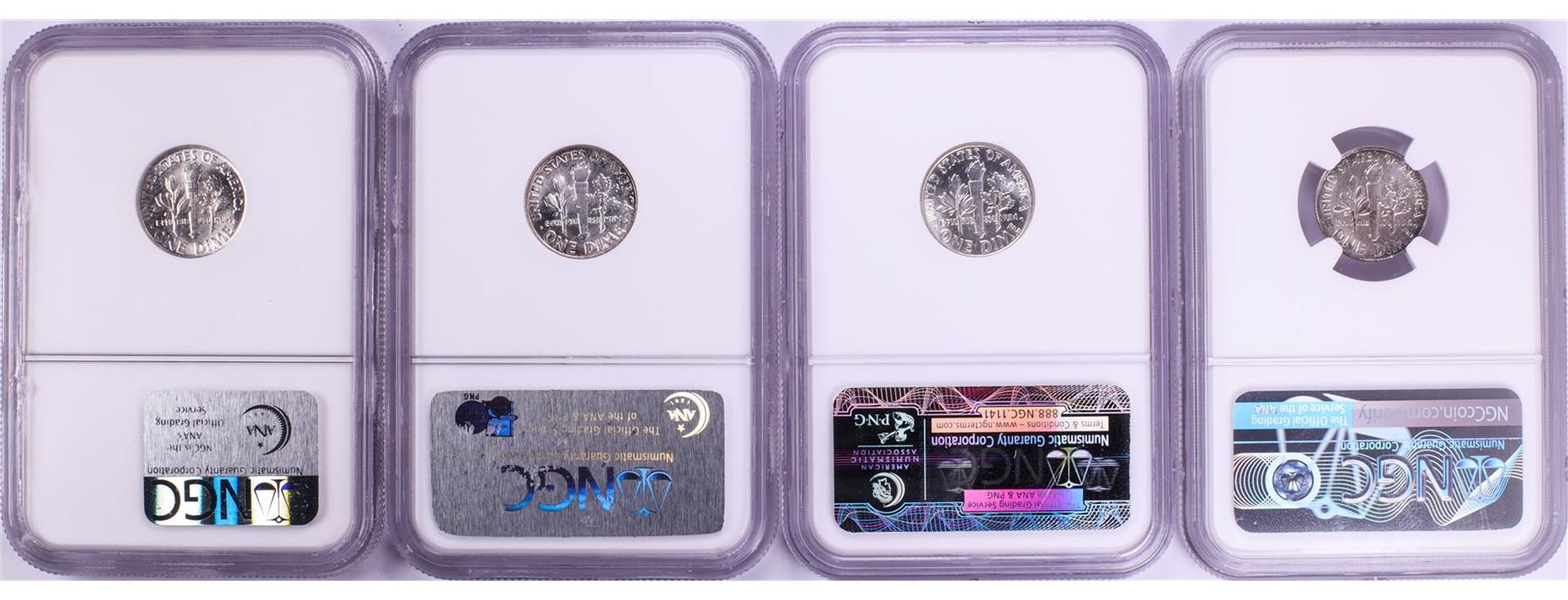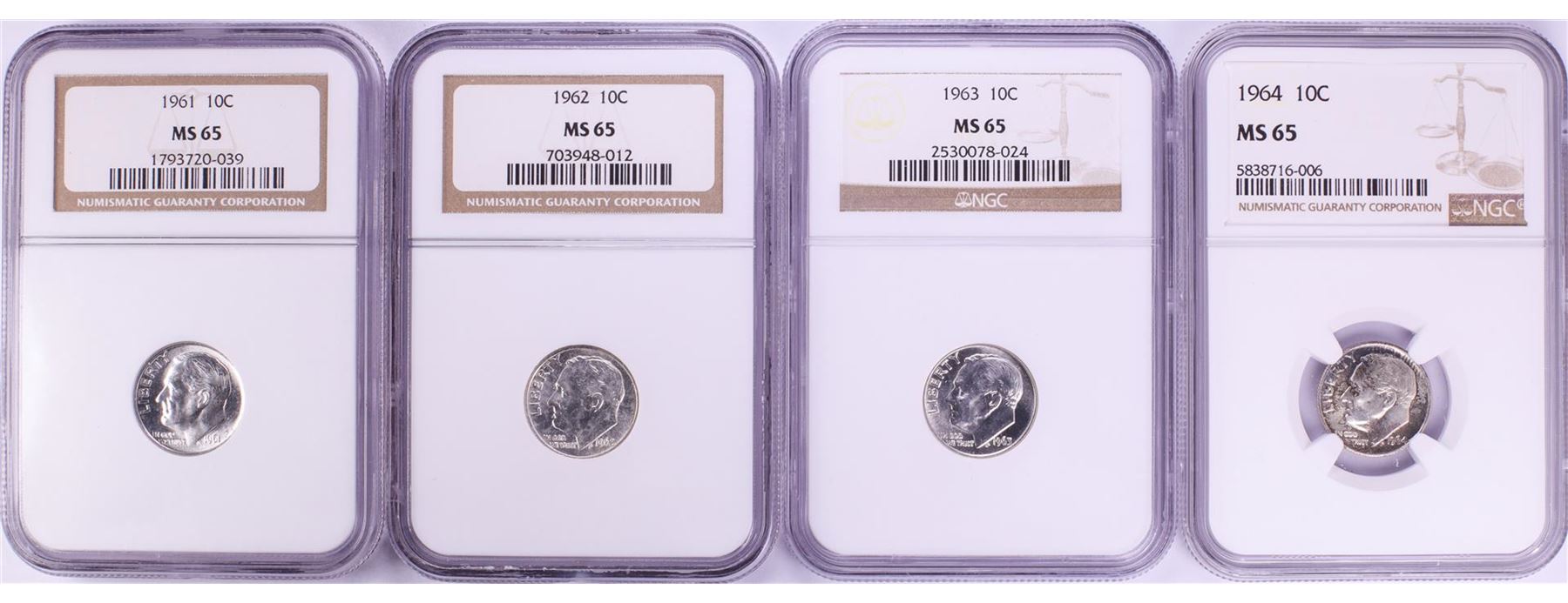 One Lot of 1961-1964 Roosevelt Dime Coins NGC MS65. NGC Certified.