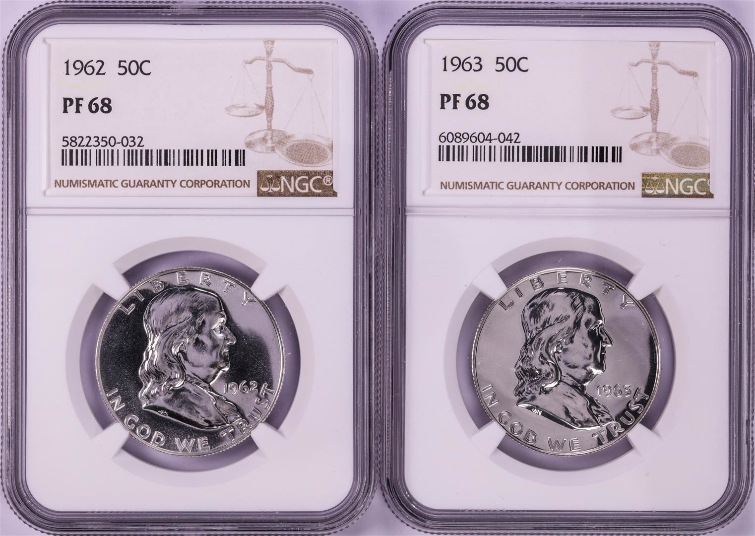 One Lot of 1962-1963 Proof Franklin Half Dollar Coins NGC PF68. NGC Certified.