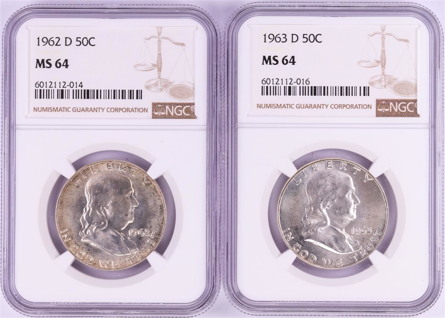 One Lot of 1962-D & 1963-D Franklin Half Dollar Coins NGC MS64. NGC Certified.