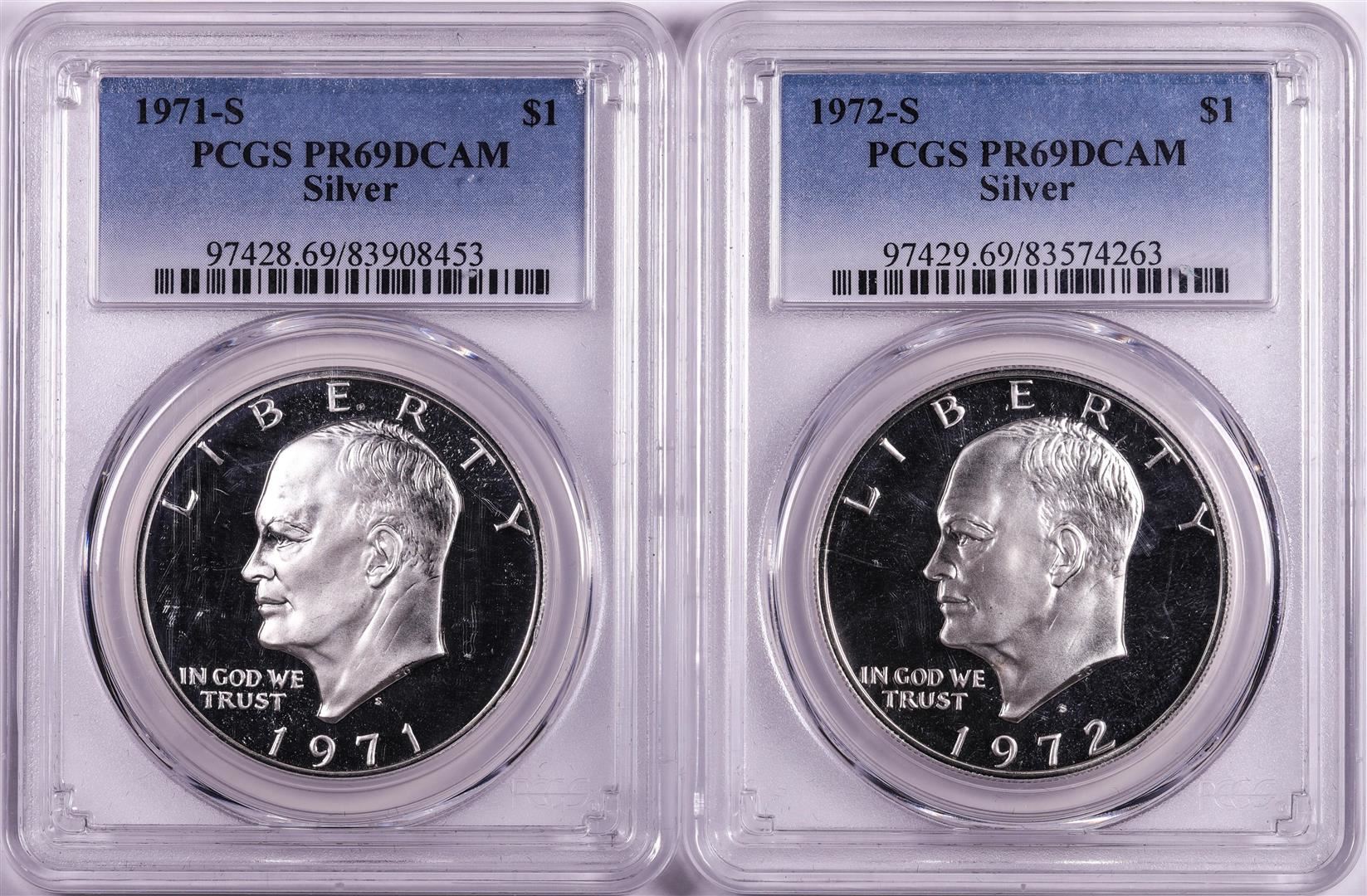 Lot of 1971-S & 1972-S $1 Proof Eisenhower Silver Dollar Coins PCGS PR69DCAM