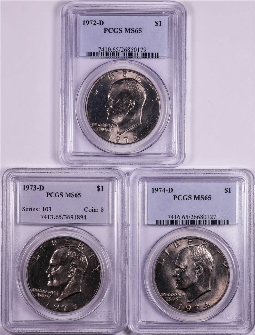 One Lot of 1972-D to 1974-D $1 Eisenhower Dollar Coins PCGS MS65. PCGS Graded.