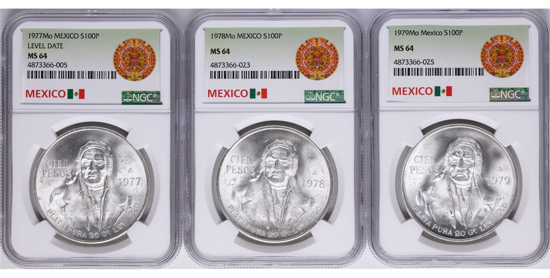 Lot of 1977Mo-1979Mo Mexico 100 Pesos Silver Coins NGC MS64