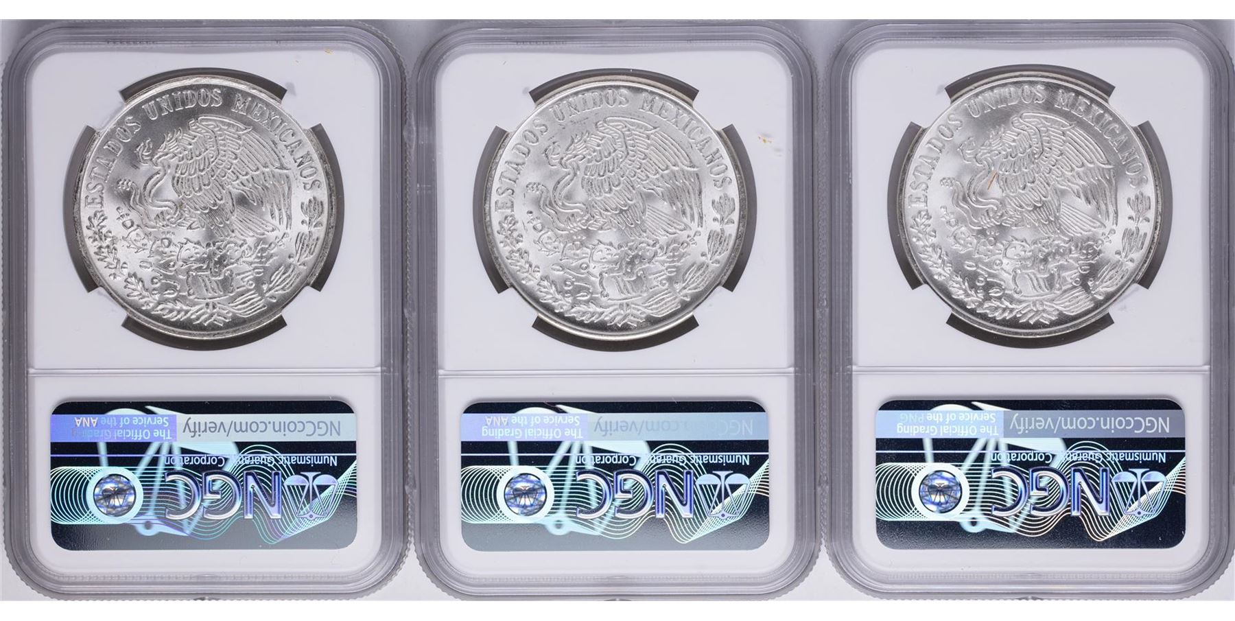 One Lot of 1977Mo-1979Mo Mexico 100 Pesos Silver Coins NGC MS64. NGC Certified.