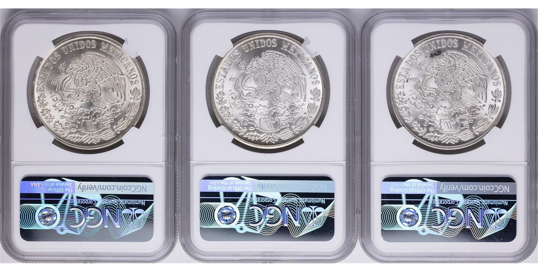 One Lot of 1977Mo-1979Mo Mexico 100 Pesos Silver Coins NGC MS64. NGC Certified.