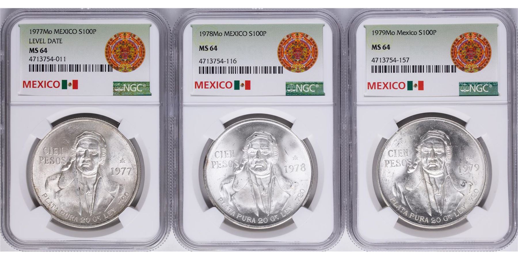 One Lot of 1977Mo-1979Mo Mexico 100 Pesos Silver Coins NGC MS64. NGC Certified.