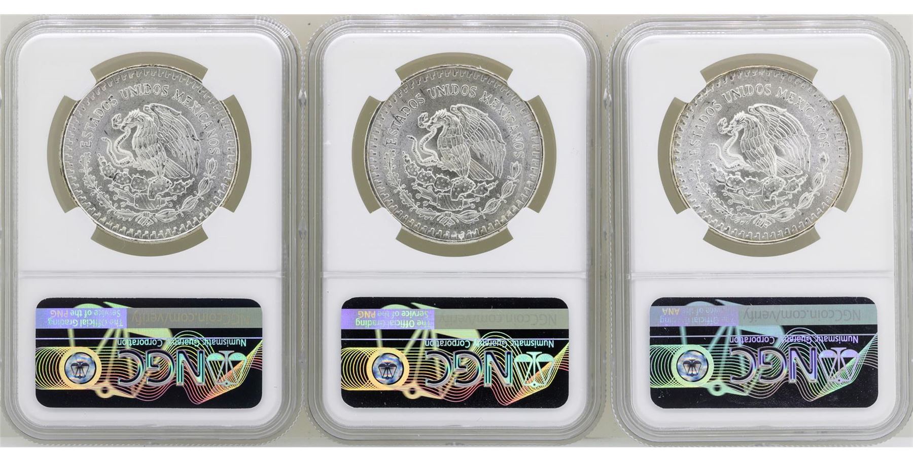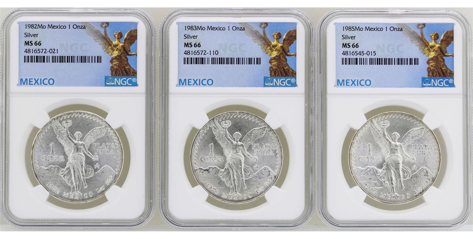 One Lot of 1982Mo/1983Mo/1985Mo Mexico Libertad Onza Silver Coins NGC MS66. NGC Certified.