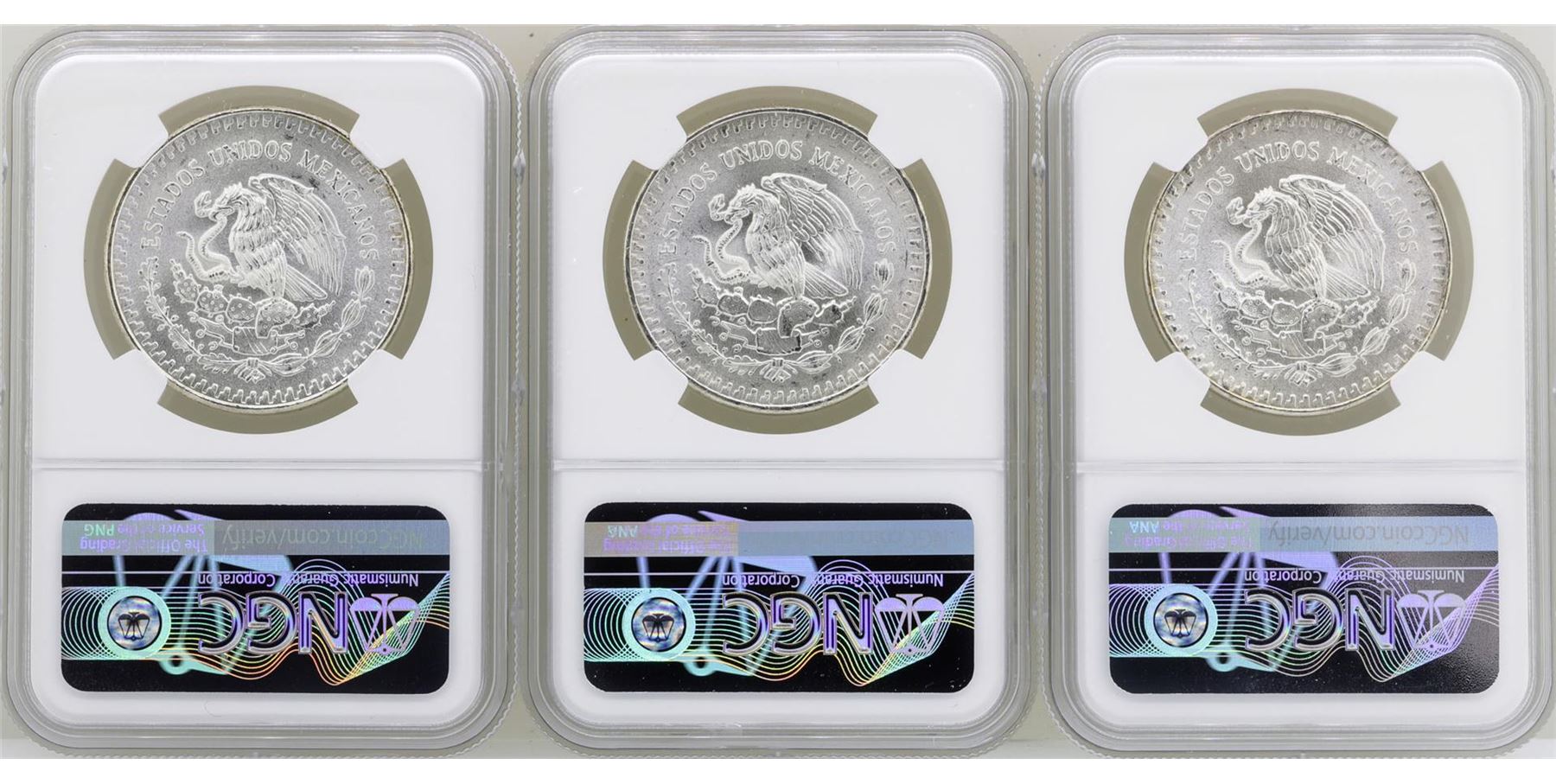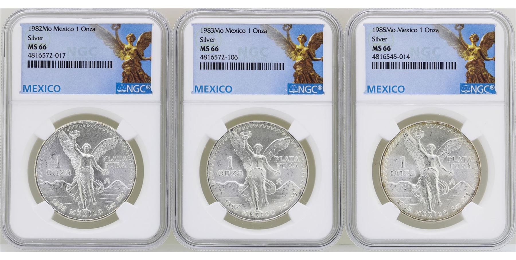One Lot of 1982Mo/1983Mo/1985Mo Mexico Libertad Onza Silver Coins NGC MS66. NGC Certified.