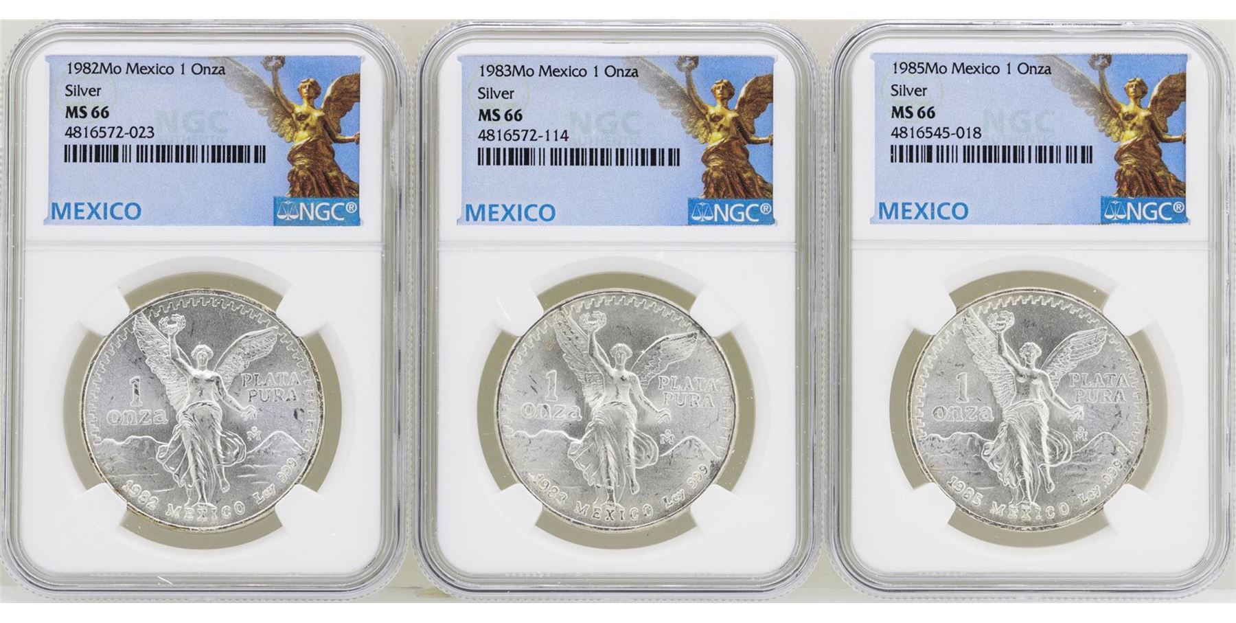 One Lot of 1982Mo/1983Mo/1985Mo Mexico Libertad Onza Silver Coins NGC MS66. NGC Certified.