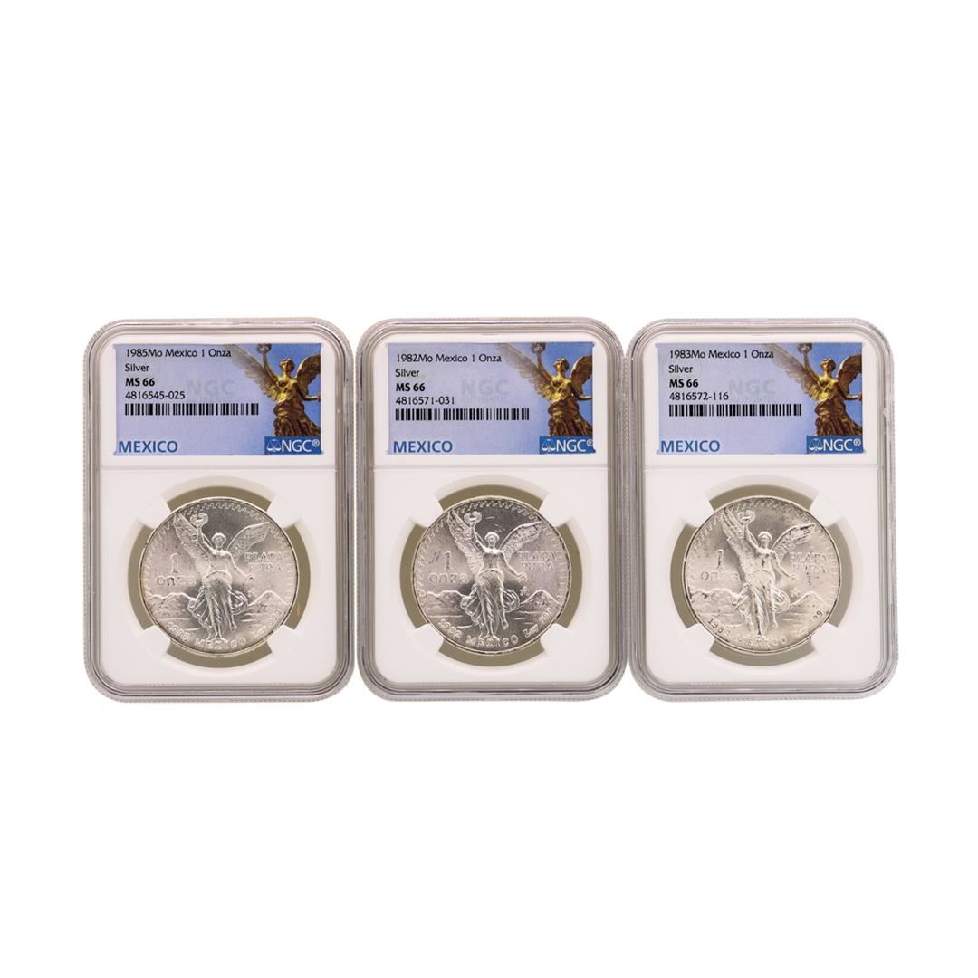 One Lot of 1982Mo/1983Mo/1985Mo Mexico Libertad Onza Silver Coins NGC MS66. NGC Certified.