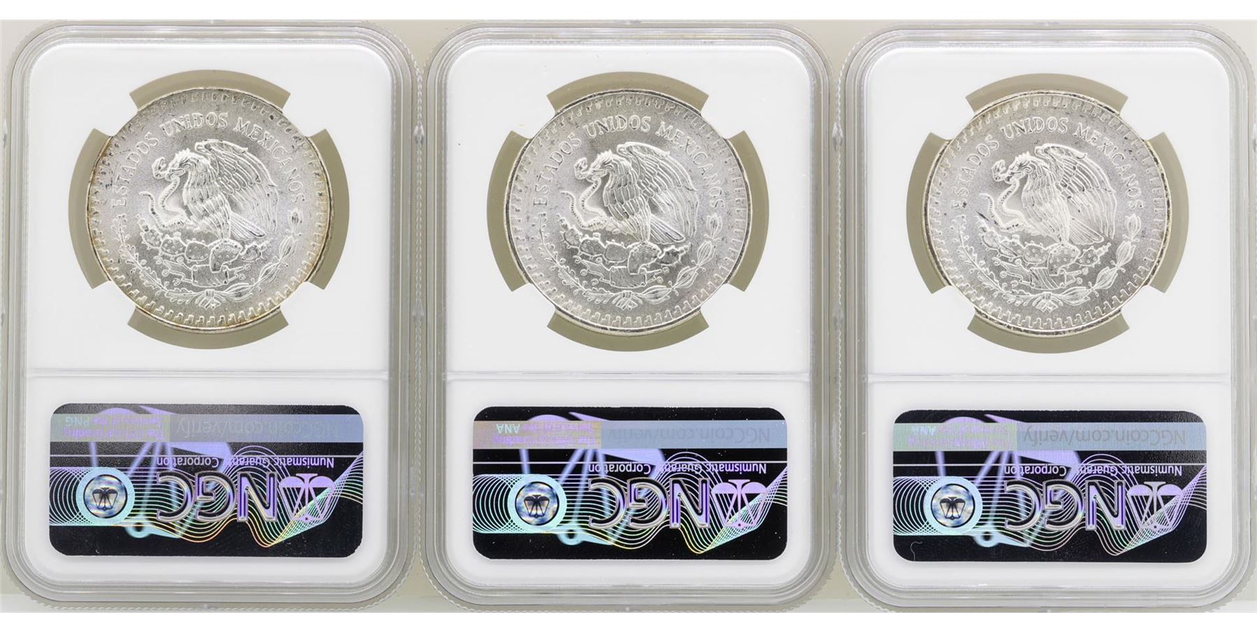 One Lot of 1982Mo/1983Mo/1985Mo Mexico Libertad Onza Silver Coins NGC MS66. NGC Certified.
