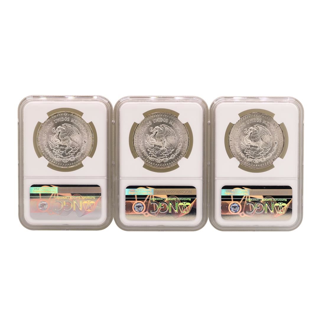 One Lot of 1982Mo/1983Mo/1985Mo Mexico Libertad Onza Silver Coins NGC MS66. NGC Certified.