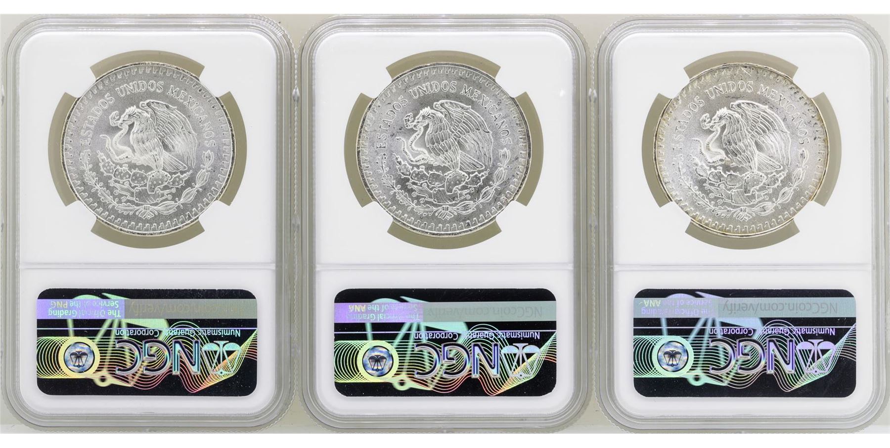 One Lot of 1982Mo/1983Mo/1985Mo Mexico Libertad Onza Silver Coins NGC MS66. NGC Certified.