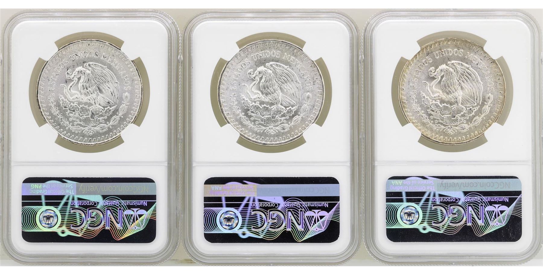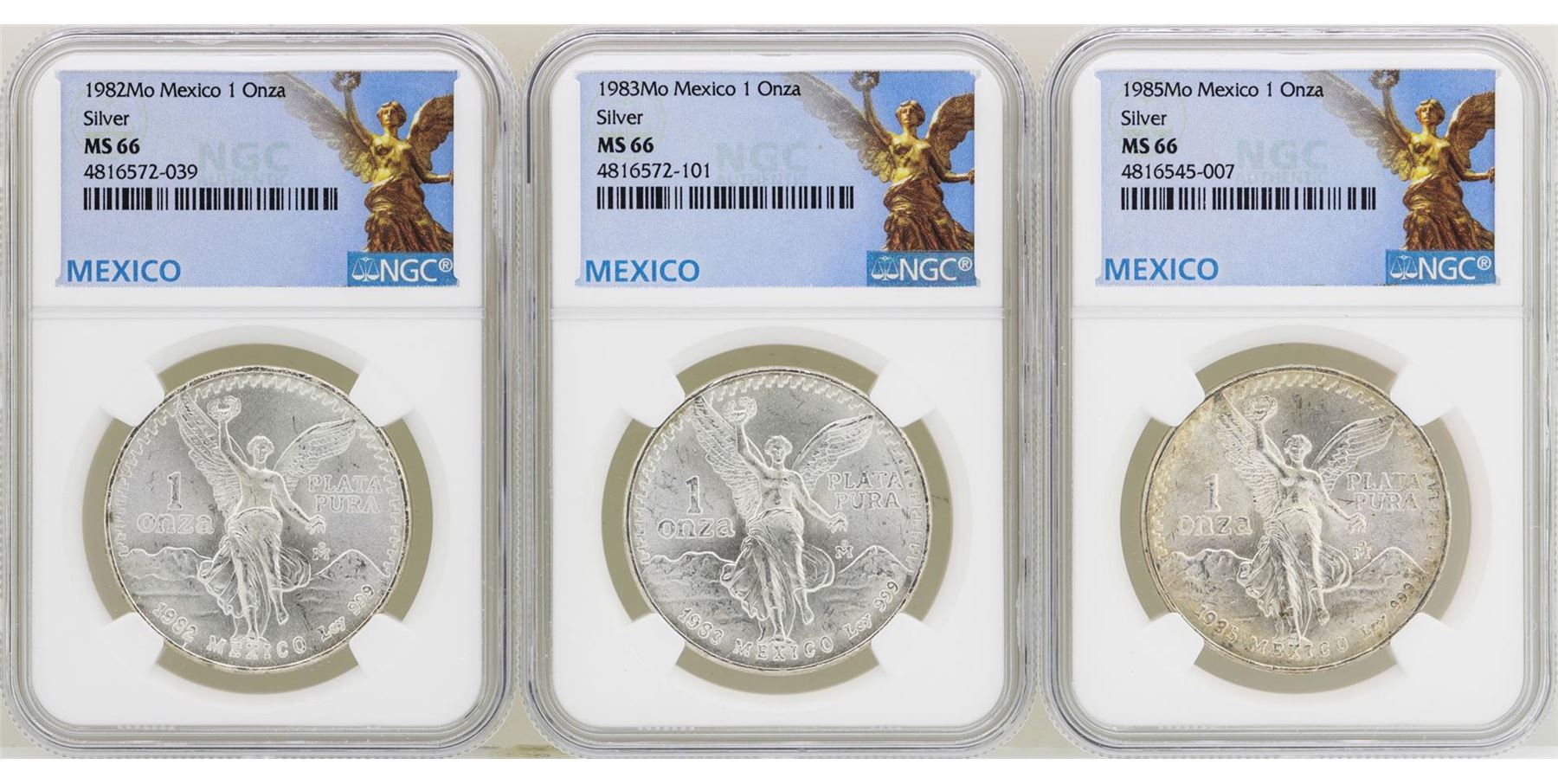 One Lot of 1982Mo/1983Mo/1985Mo Mexico Libertad Onza Silver Coins NGC MS66. NGC Certified.