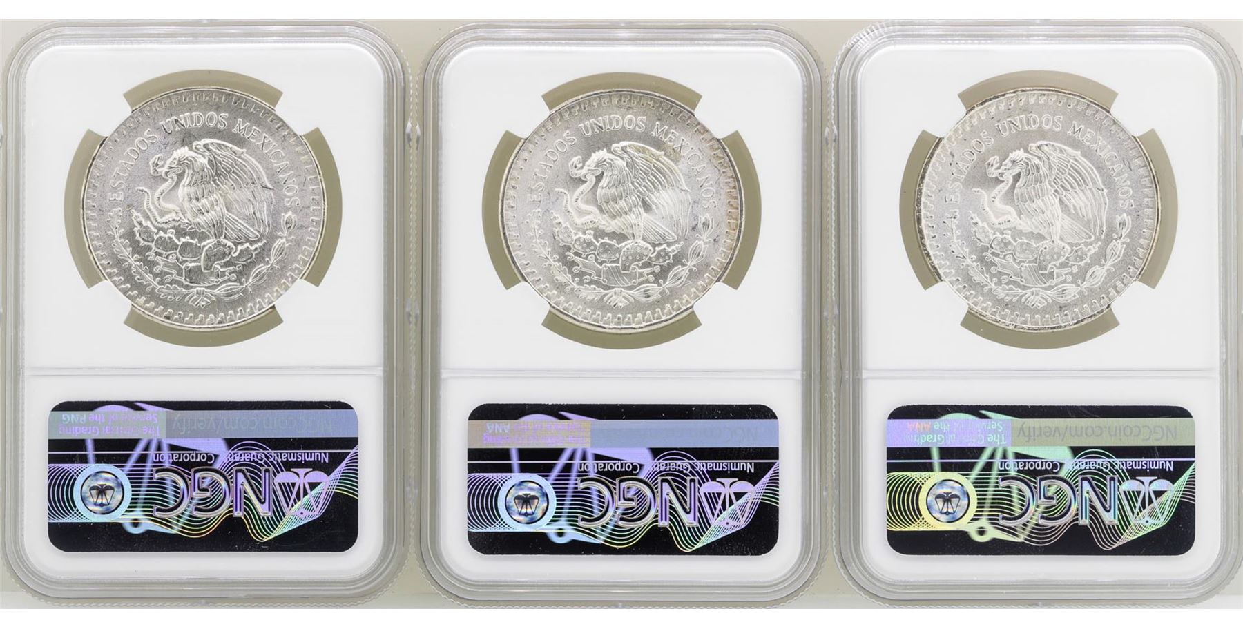 One Lot of 1982Mo/1983Mo/1985Mo Mexico Libertad Onza Silver Coins NGC MS66. NGC Certified.