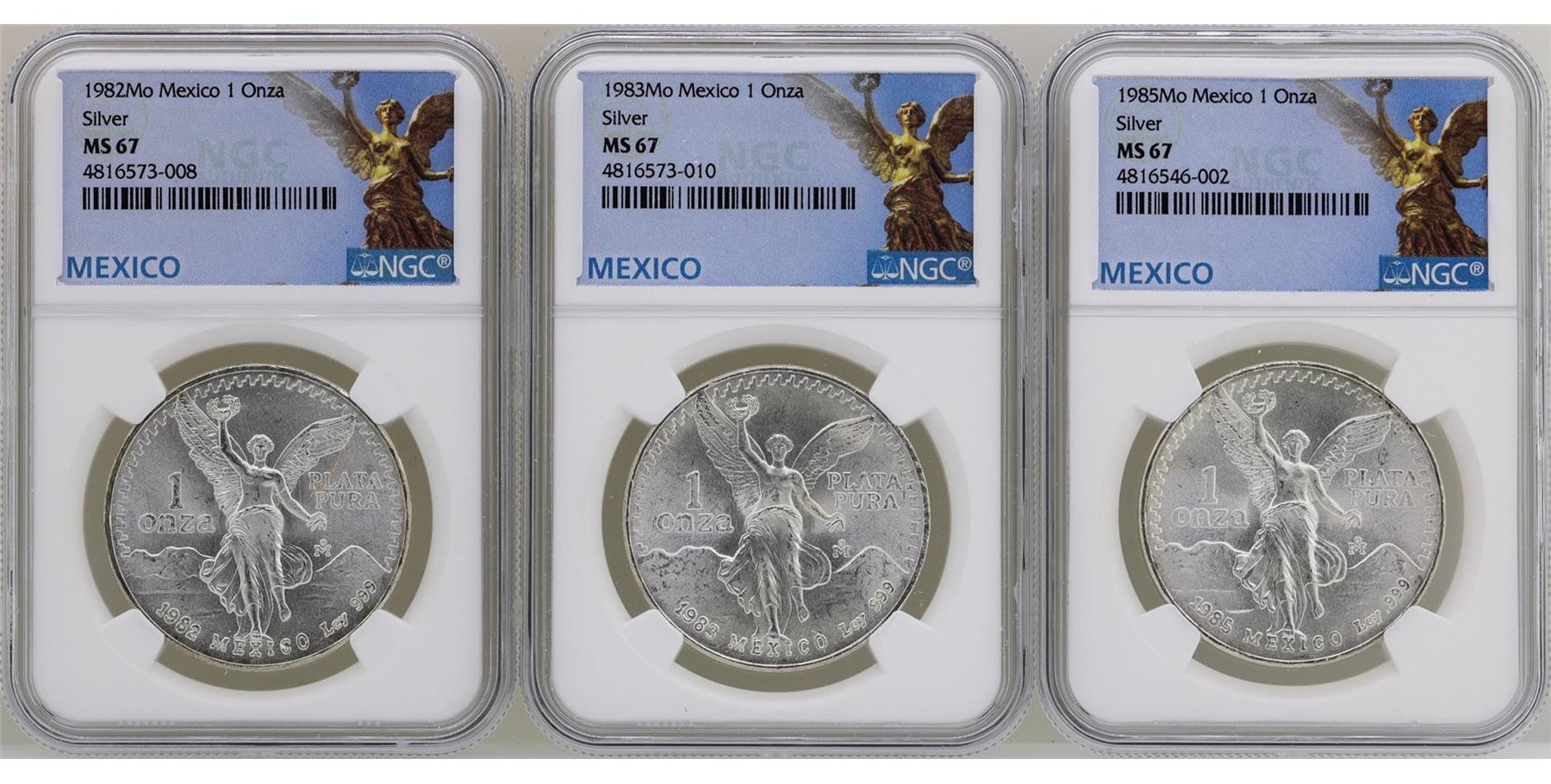 One Lot of 1982Mo/1983Mo/1985Mo Mexico Libertad Onza Silver Coins NGC MS67. NGC Certified.