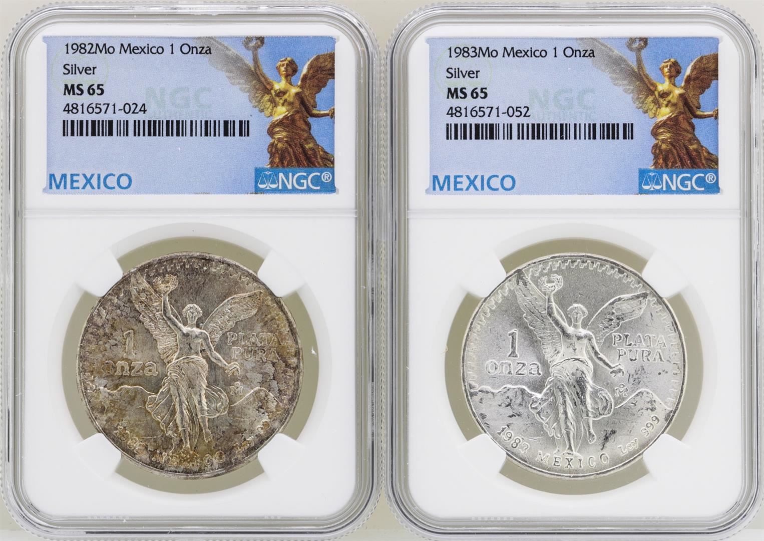 One Lot of 1982Mo & 1983Mo Mexico Libertad Onza Silver Coins NGC MS65. NGC Certified.