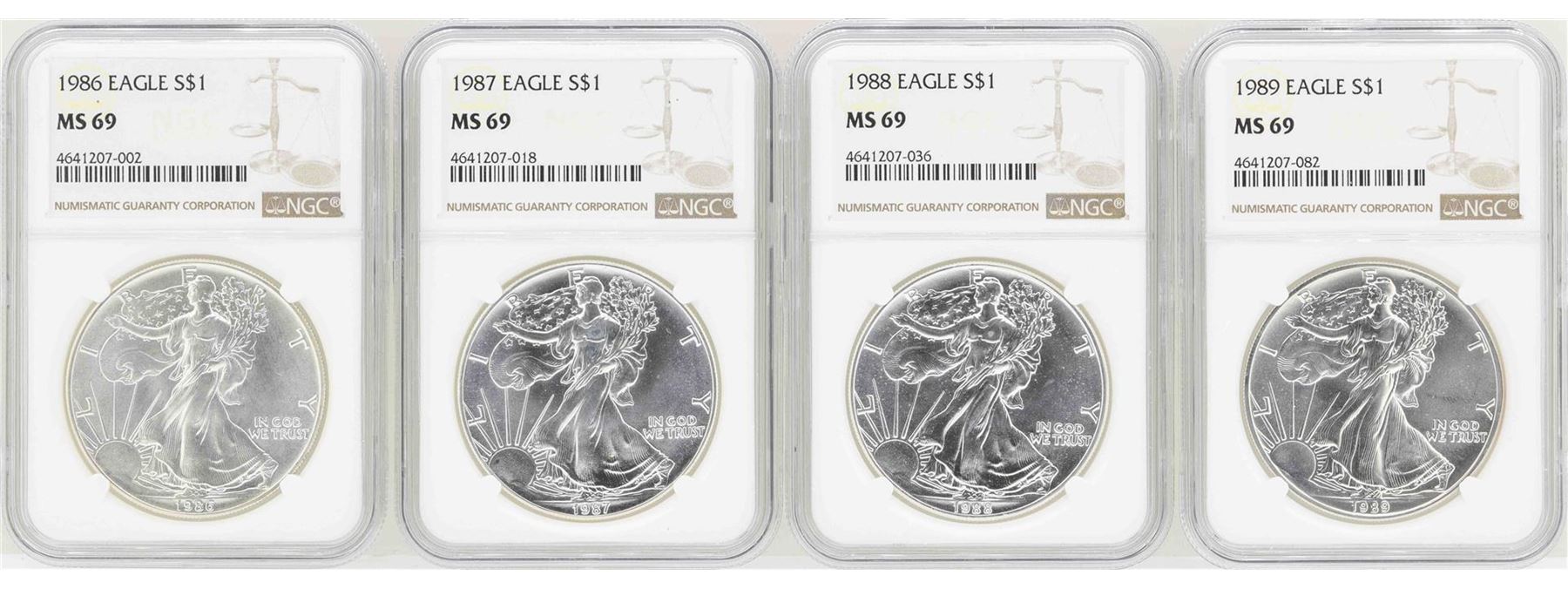 One Lot of 1986-1989 $1 American Silver Eagle Coins NGC MS69. NGC Certified.