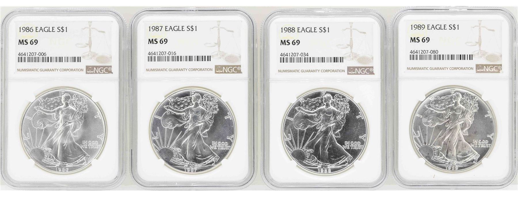 One Lot of 1986-1989 $1 American Silver Eagle Coins NGC MS69. NGC Certified.