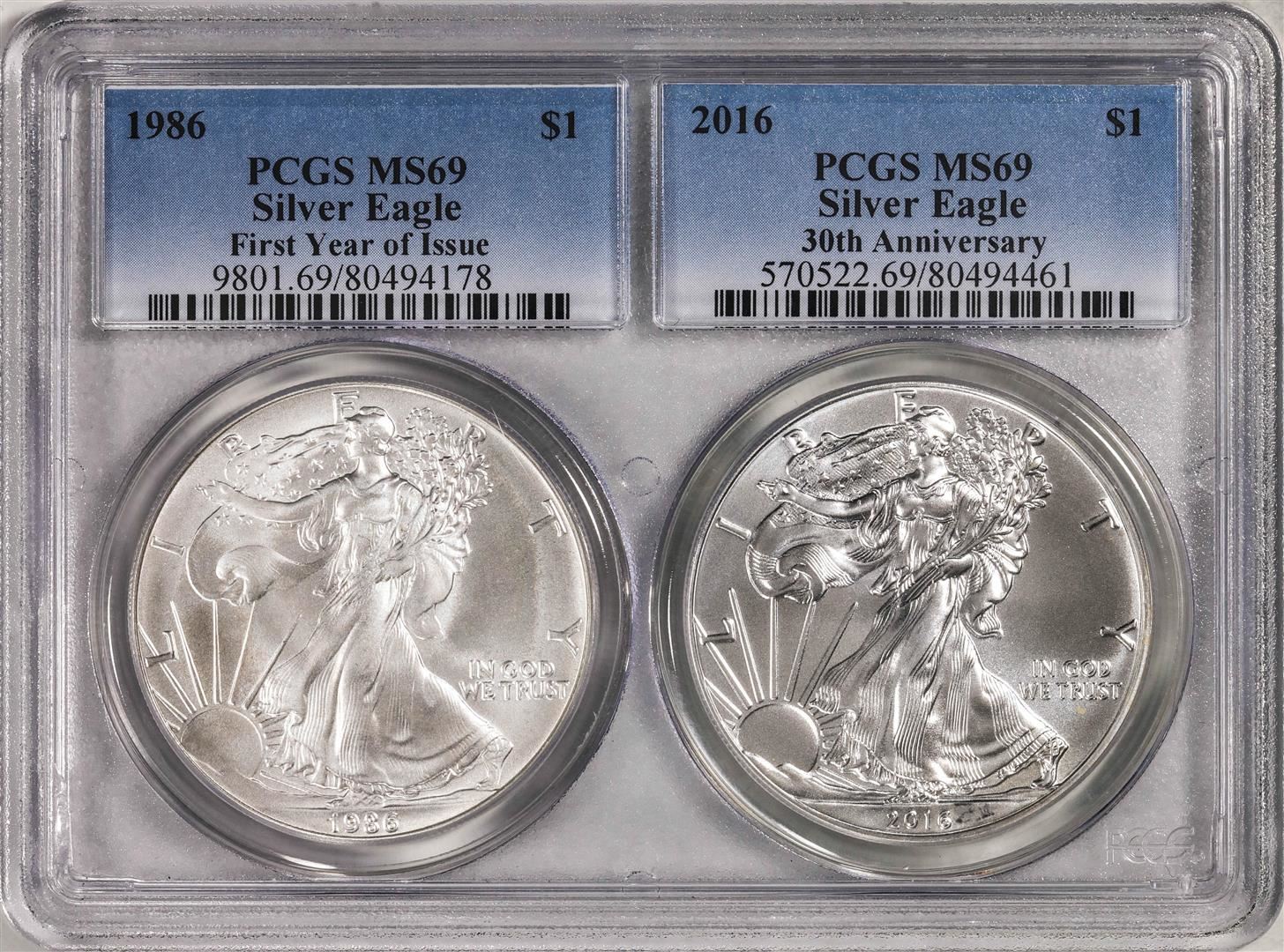 Lot of 1986 & 2016 $1 American Silver Eagle 30th Anniversary 2 Coin Set PCGS MS69