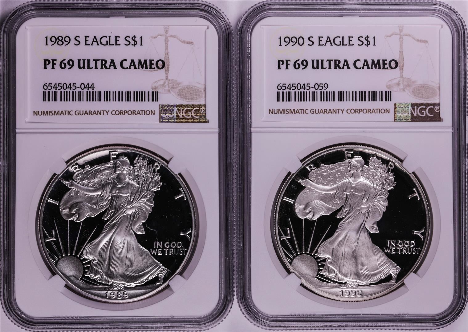 One Lot of 1989-1990 $1 Proof American Silver Eagle Coins NGC PF69 Ultra Cameo. NGC Certified.