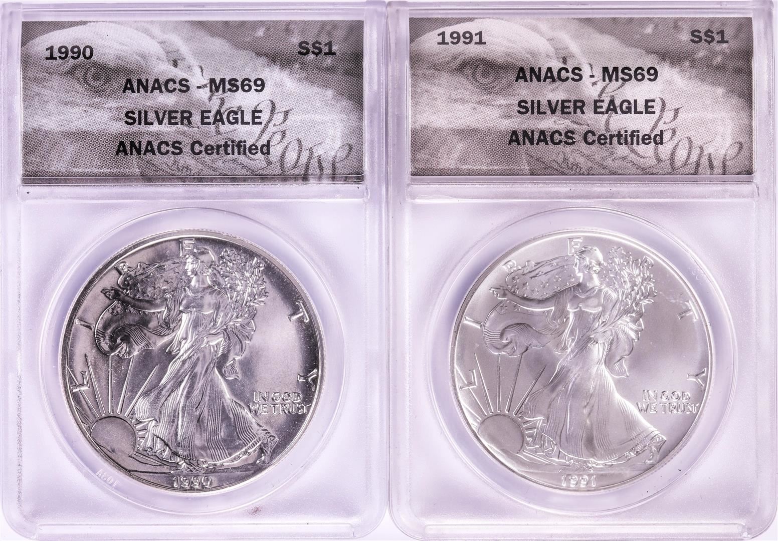 One Lot of 1990-1991 $1 American Silver Eagle Coins ANACS MS69. ANACS Certified.