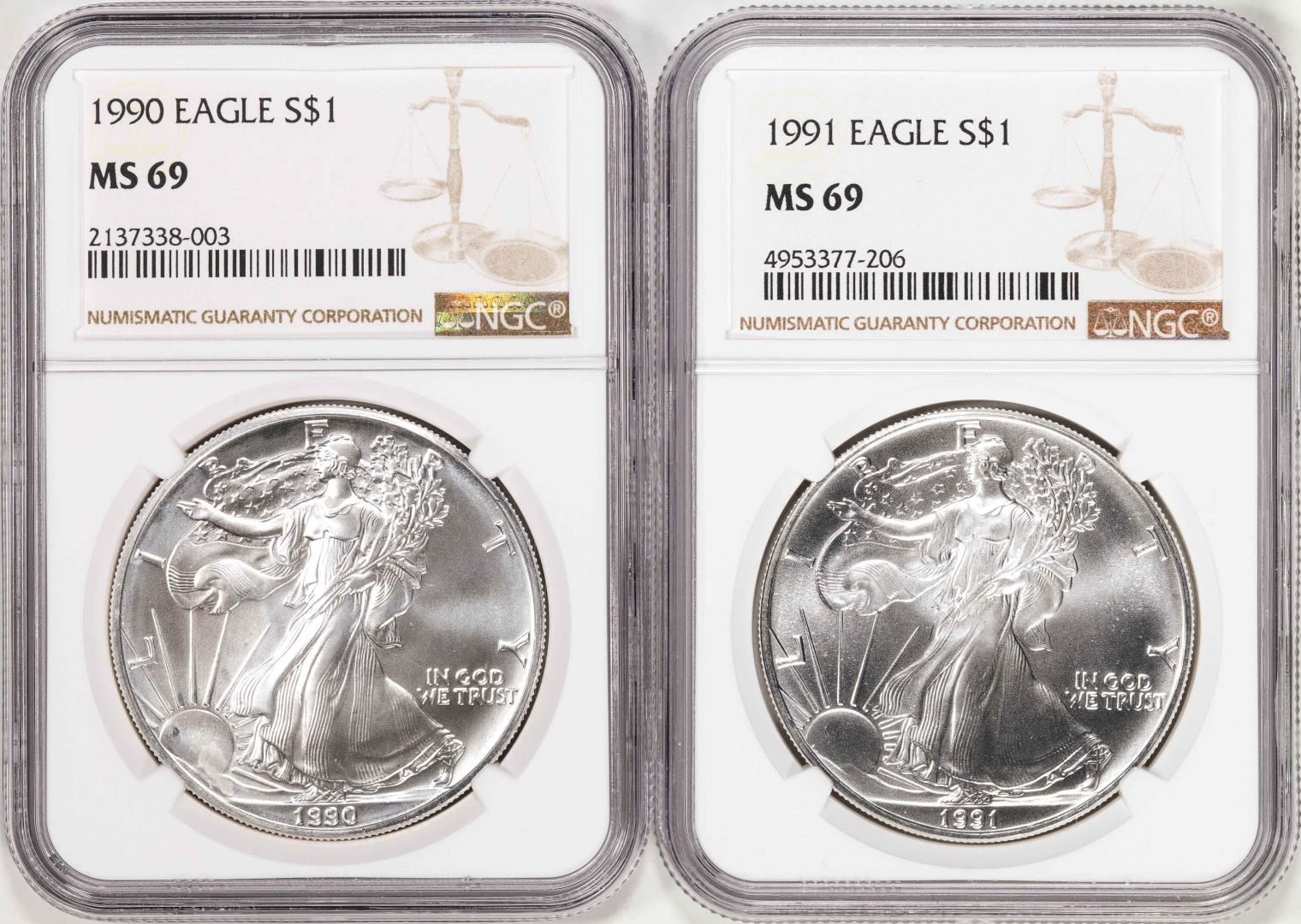 One Lot of 1990-1991 $1 American Silver Eagle Coins NGC MS69. NGC Certified.